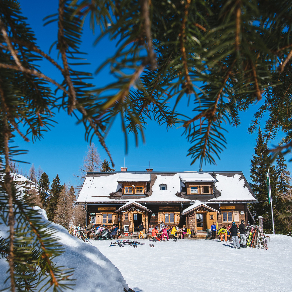 There are certain secrets you can only reveal with a heavy heart. Such as Galsterbergalm in the Ennstal Alps. The journey alone is a spectacle. First, the luggage is loaded into the gondola of the mountain railway. Then onwards to the mountain station, where a Ski-Doo transports the luggage to the self-catering huts. The skiers can already begin here; the others go for their first small hike to the holiday residences at an altitude of 1800 m.