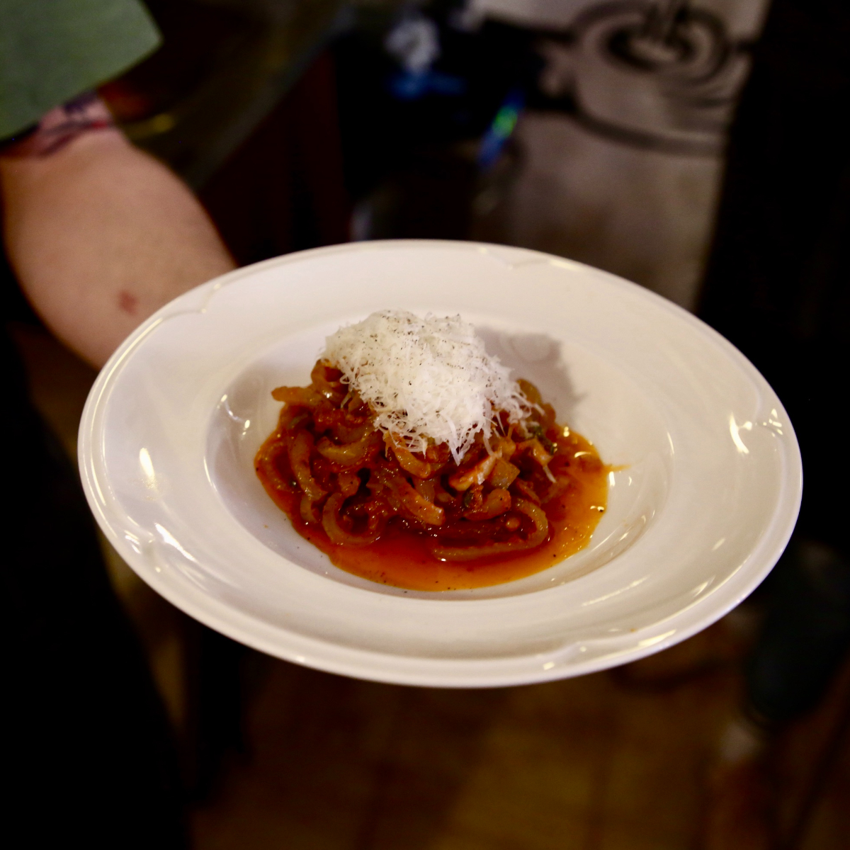 On closer inspection, you realise what is depicted: sparkling wine, cured meat, and a sow shortly before slaughter. The pigskin pasta, among other things, was made from this. Yet, visually, they are hardly distinguishable from traditional tagliatelle. And in terms of taste, they also blend in well with the creamy, salty tomato sauce, except that it tastes a little more full-bodied and fatty, in keeping with the restaurant's credo: "Fat, salt and alcohol."
