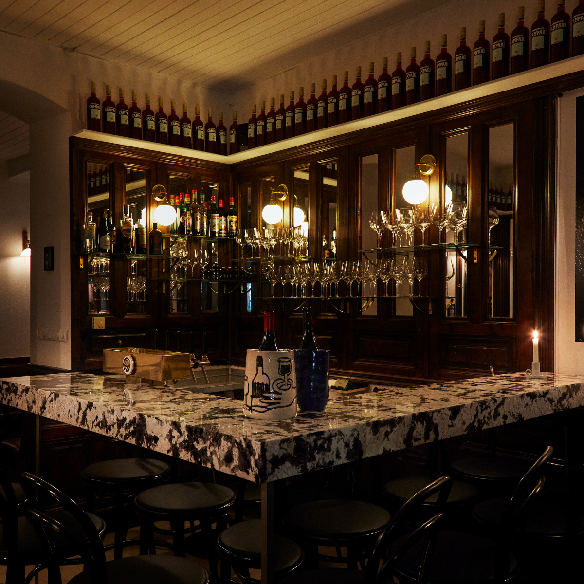 Pictures of the team, acquaintances and producer friends hang on the wood-panelled wall. The interior is still somewhat reminiscent of the Beisl that used to be here. The wooden wall panelling, and the dim round lights were allowed to stay. To ensure it doesn't get too rustic, a bright bar counter and large-format photographs have been added, which seem abstract at first glance.