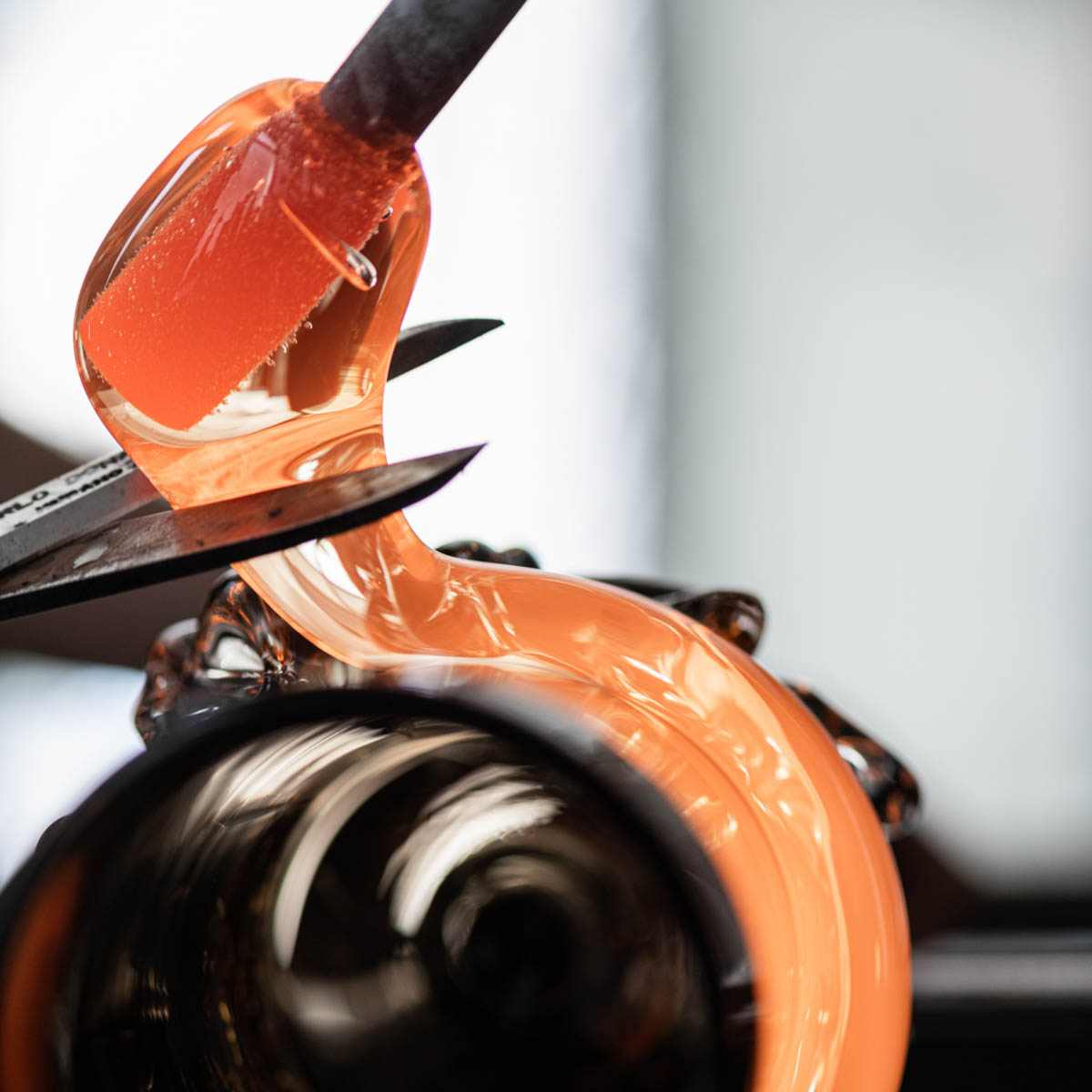 This is where Robert Comploj and his young employees, who come to him from various countries, work to the accompaniment of loud music. You can watch them at work through the large glass front: How they scoop the glass out of the egg-shaped furnace in which it melts at 1100 degrees. How they blow it, mould it by hand or cut it to size with scissors.