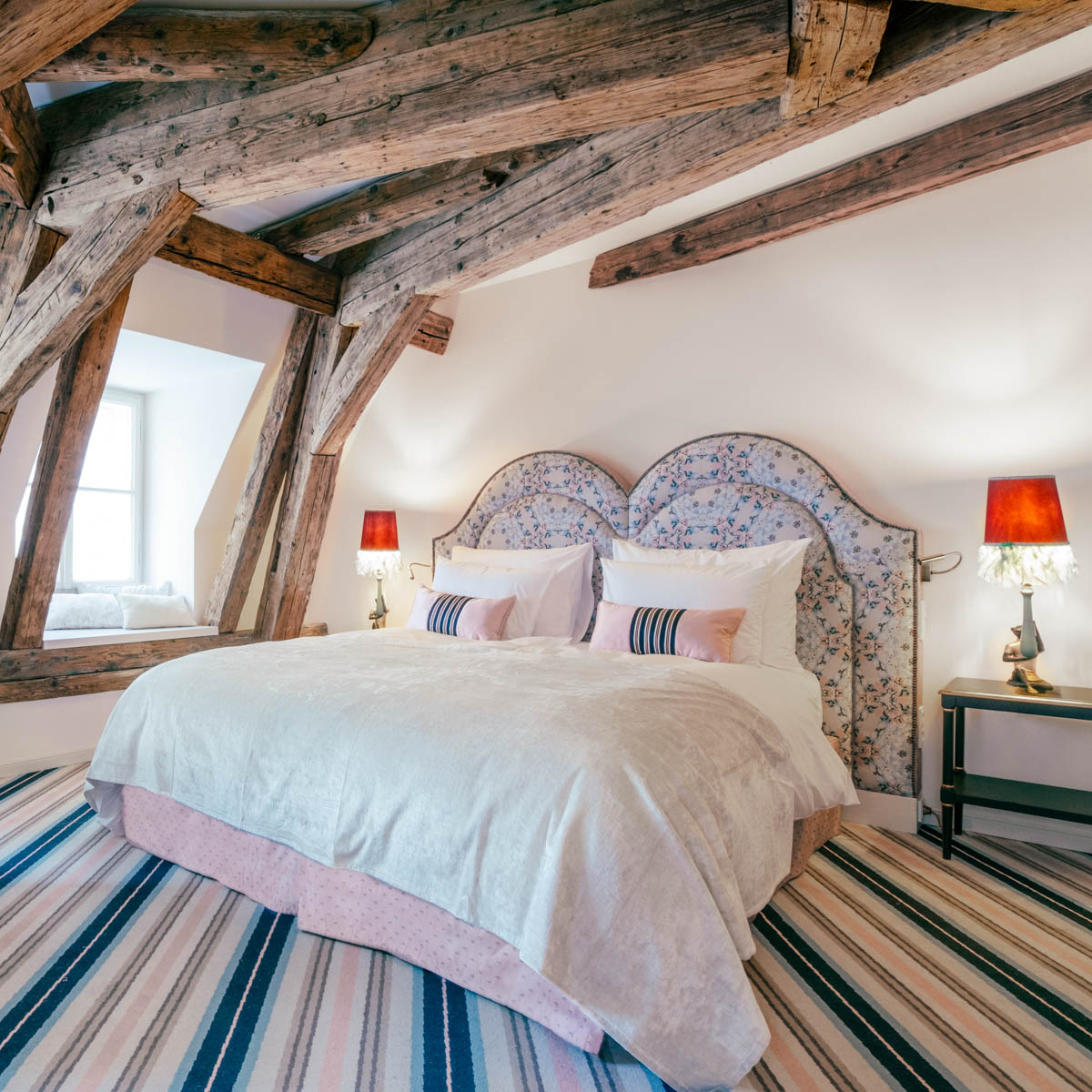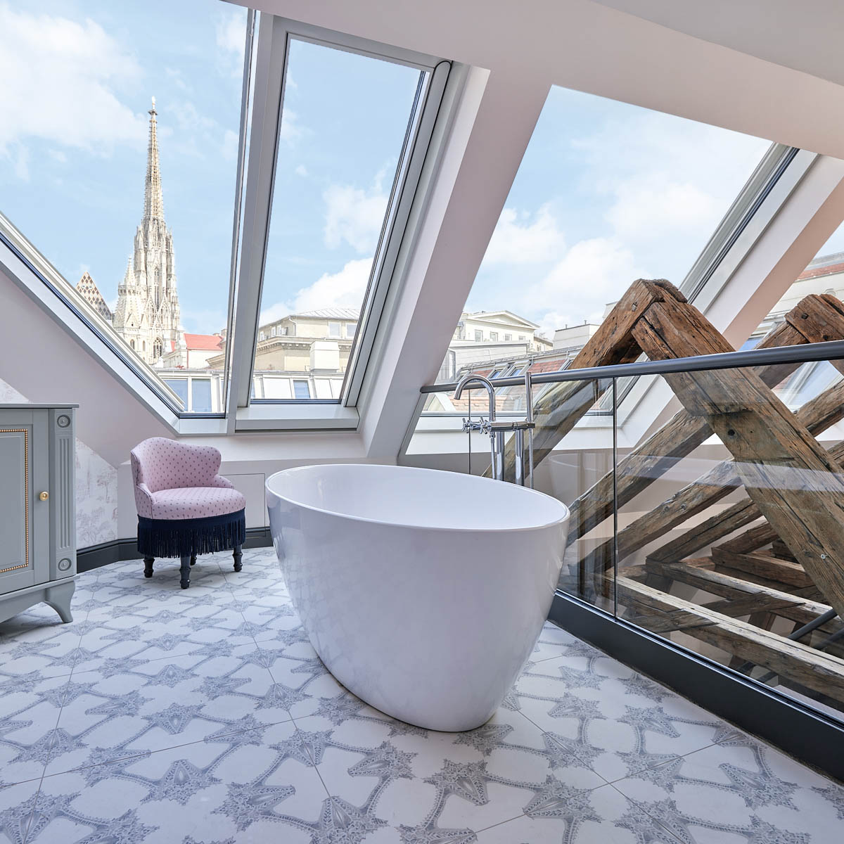Particularly charming: the suites on the top floor in the “Sam” wing, named after the former owner of the house, Samuel Oppenheimer. The load-bearing beams of the roof truss are exposed and form a successful contrast to the sumptuous furnishings, which include an ornamental fireplace, a sky-blue dressing table, and a bed with high wall cushions bearing the curve of the famous Habsburg lip. Also unique: the view from the window directly onto St. Stephen's Cathedral!