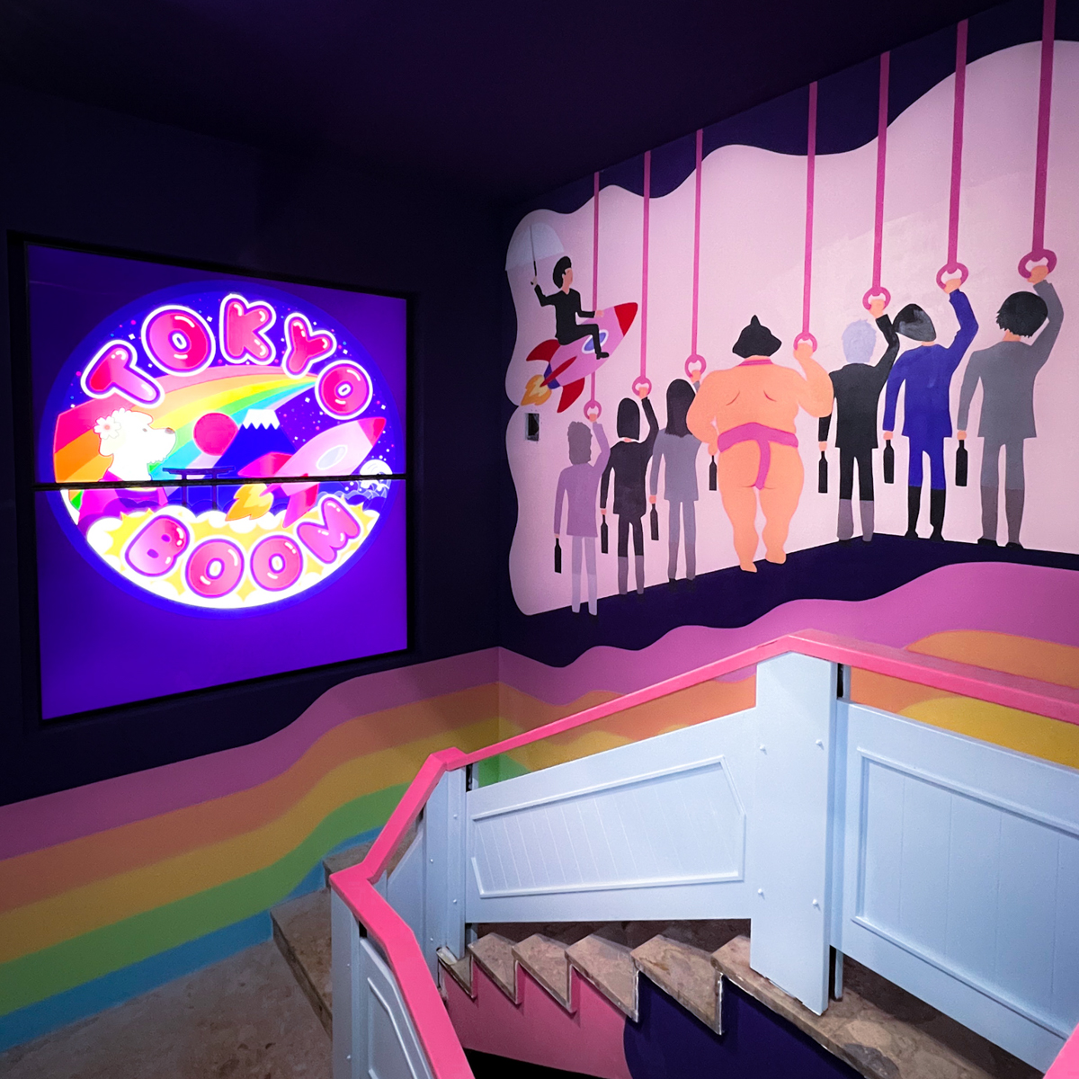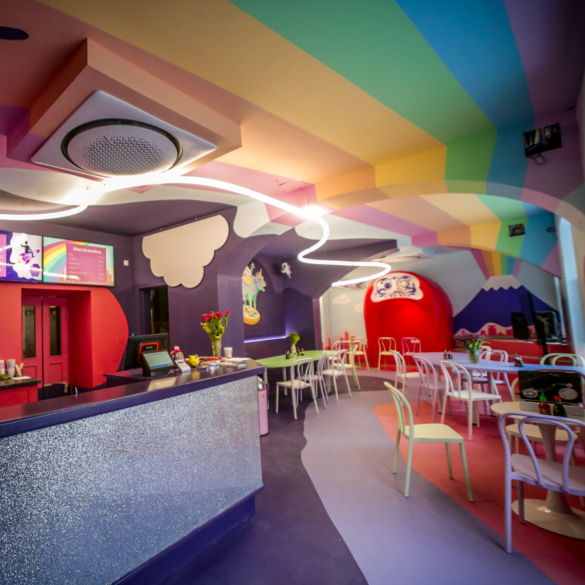 Sooner than expected, the crazy idea became serious: against all odds (cancellations from construction companies, Omikron, rising costs), the run-down corner pub was renovated from the ground up. Large parts, such as the entire demolition, were done independently. After three months, the dark room with its wood-panelled walls was transformed into a brightly coloured magical world: Flying cows on the walls (a symbol of their friendship, as Lisa tells us, since they met at a Tokyo pub called Pink Cow).