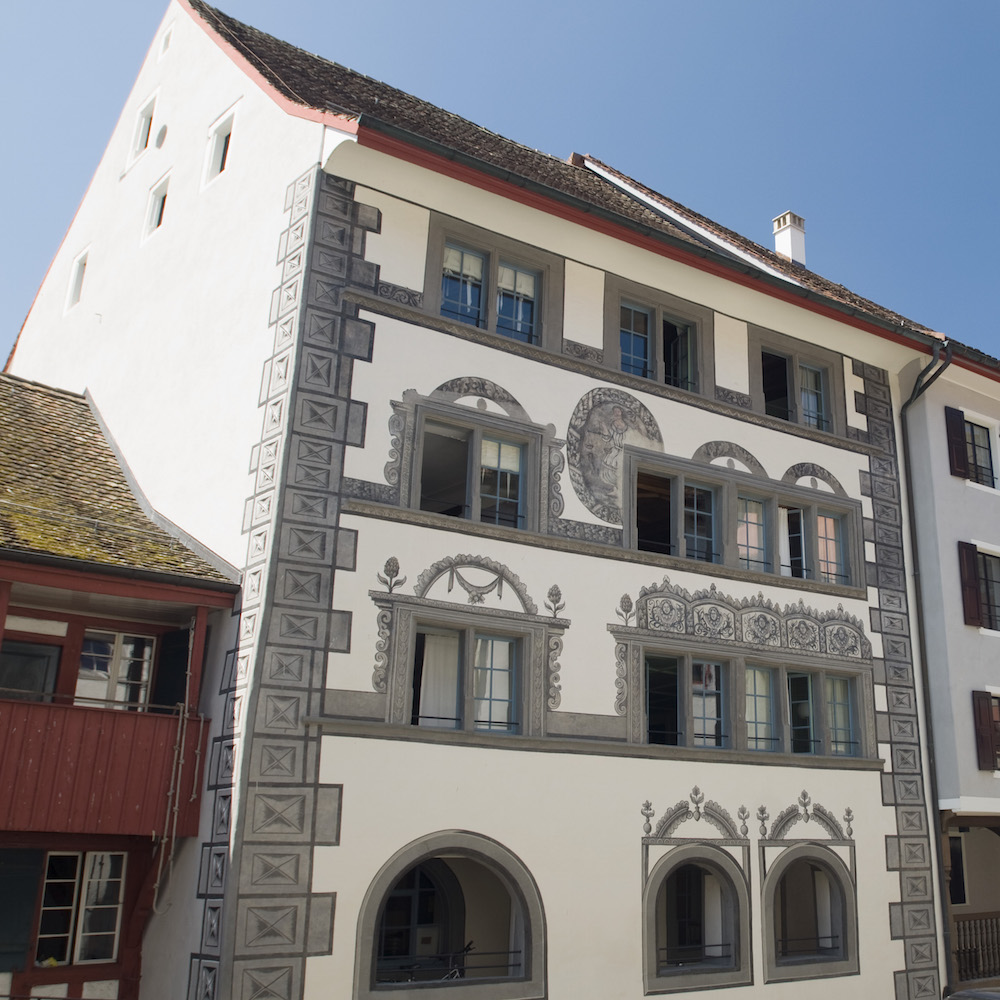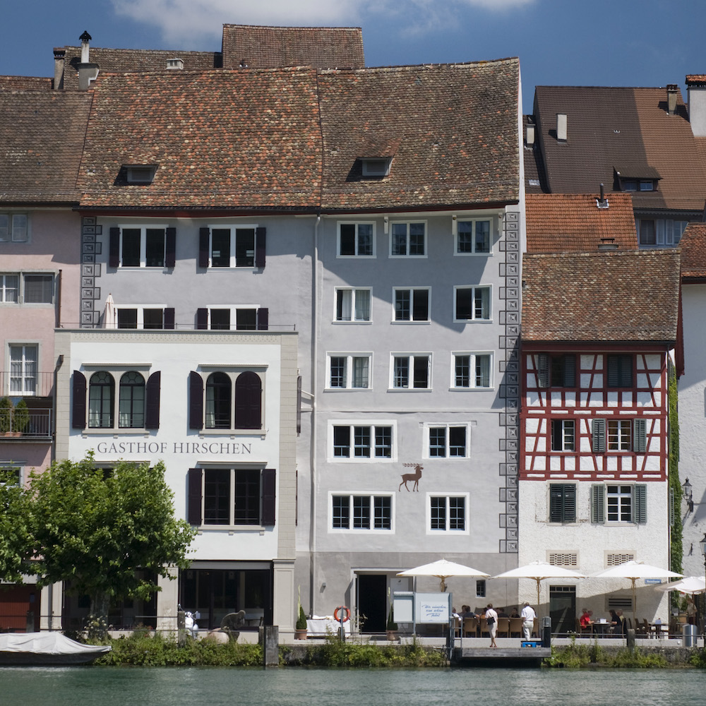 To my great surprise, the journey only took just under half an hour to Eglisau from Zurich Seefeld. Surrounded by vineyards and located directly on the Rhine, we arrive and get out of the car. The road down to Gasthof Hirschen is picturesque and quaint. The house itself is a historical building, late Gothic, with exposed façade paintings of historical importance. I wish we could stay overnight!