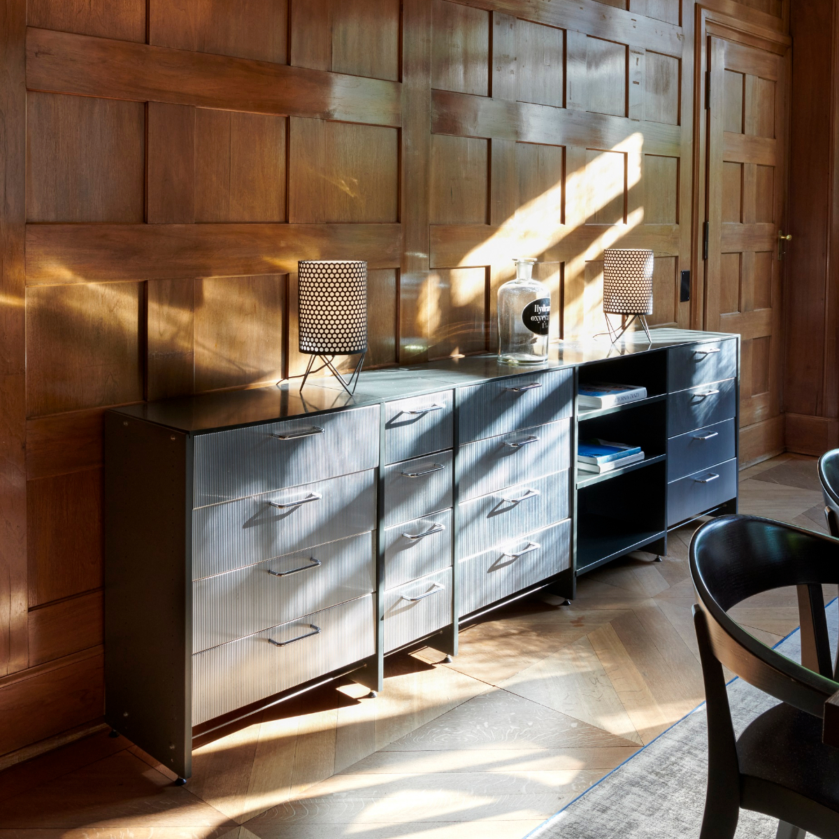 An adjoining room is equipped with a five-metre-long wooden table for conferences or private dinner parties. In the basement, a cinema beckons for private screenings, a remnant from the time when the villa was a dull office building with commercial tenants, Universal Pictures among them.