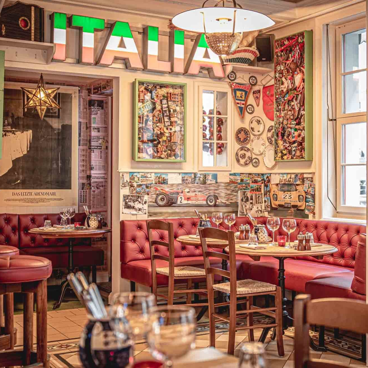 A unique eye-catcher, however, is the interior design, which virtually overwhelms you with curious Italianatà: many small pictures of saints, colourful hand-painted plates and halves of ham hanging from the ceiling are arranged into a crammed, opulent whole that creates a wonderfully cosy, crazy ambience.