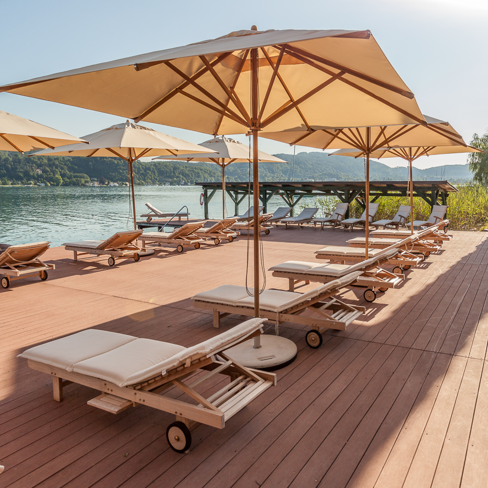 Daher geht es lieber auf ausdauernde Wanderungen durch die umliegende wunderschöne Natur oder zum Yoga an den malerischen breiten Steg direkt am Wörthersee, an dem man sich dank seines türkisblauen Wassers während der Sommermonate, ganz wunderbar in die Karibik träumen kann. Und das mit Stil. Hell gepolsterte Teakliegen und ebensolche Sonnenschirme stehen bereit. Es gibt eine Sauna und sogar ein Tretboot. Traumhaft!