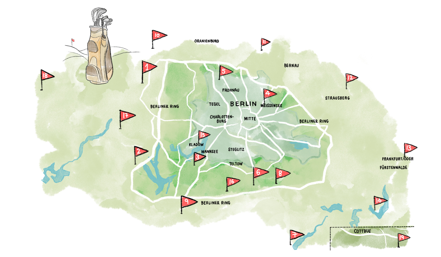 Golfclub Kallin (1), Märkischer Golfclub Potsdam (2), Golf- und Landclub Berlin-Wansee (3), Golfclub Pankow/Blankenburg/Weissensee (4), Berliner Golfclub Stolper Heide (5), Golfclub Mahlow (6), Berliner Golf- und Country Club Motzner See (7), Golfclub Gross Kienitz (8), Golf- und Country Club Seddiner See (9), Golf in Wall (10), Golfclub Berlin Prenden (11), Golfpark Schloss Wilkendorf (12), Golf Club an der Oder (13), Golf Club Bad Saarow (14), Berliner Golf Club Gatow (15), Golf Range Berlin-Großbeeren (16), Potsdamer Golf-Club (17), Golf- Landclub Semlin am See (18), Lausitzer Golfclub (19).