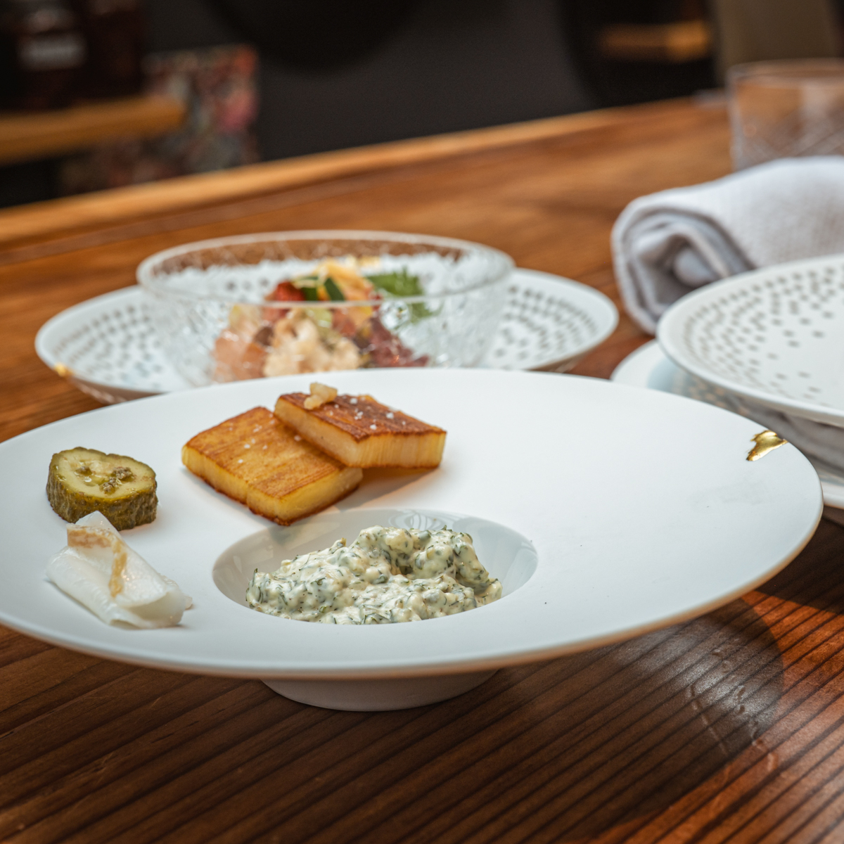 Das rauchige Trio aus Pilz, Paprika und Pistazie erweiset sich als simpel und doch so besonders. Die Saucen so schmackhaft, dass man dankbar ist fürs gereichte „Wischbrot“. Der vielleicht stärkste Gang – bis jetzt. Denn es folgt der Käsetoast und der ist ein direkter Treffer ins kulinarische Herz. Käse, Pilz und alter Essig machen des Signature Dish simpel, komplex und so, so gut. Begleitet von einem dunklen Pilz-Kombucha mit Kakao trifft fermentierte Erdigkeit auf Tiefe. Alles ergibt Sinn.