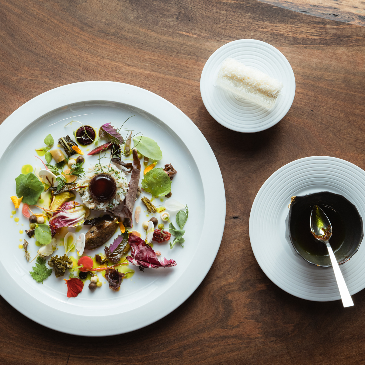 Keine Karte, kein Plan. Nur Vertrauen in das Küchenhandwerk. Wir geben uns einfach hin und landen mitten in der Jahreszeit des Überflusses. Bei einem Glas Tomatentee mit Wacholderöl dürfen wir an der Schaubar die Schätze der aktuellen Saison bestaunen: in grün, gelb und rot leuchtende Tomaten, erdige Kartoffeln, dicke Bündel behäbiger Bohnen, glänzende Butter, seidige Kräuterseitlinge, anschmiegsame hausgemachte Mascarpone und Artischocken wie aus einem barocken Stillleben.