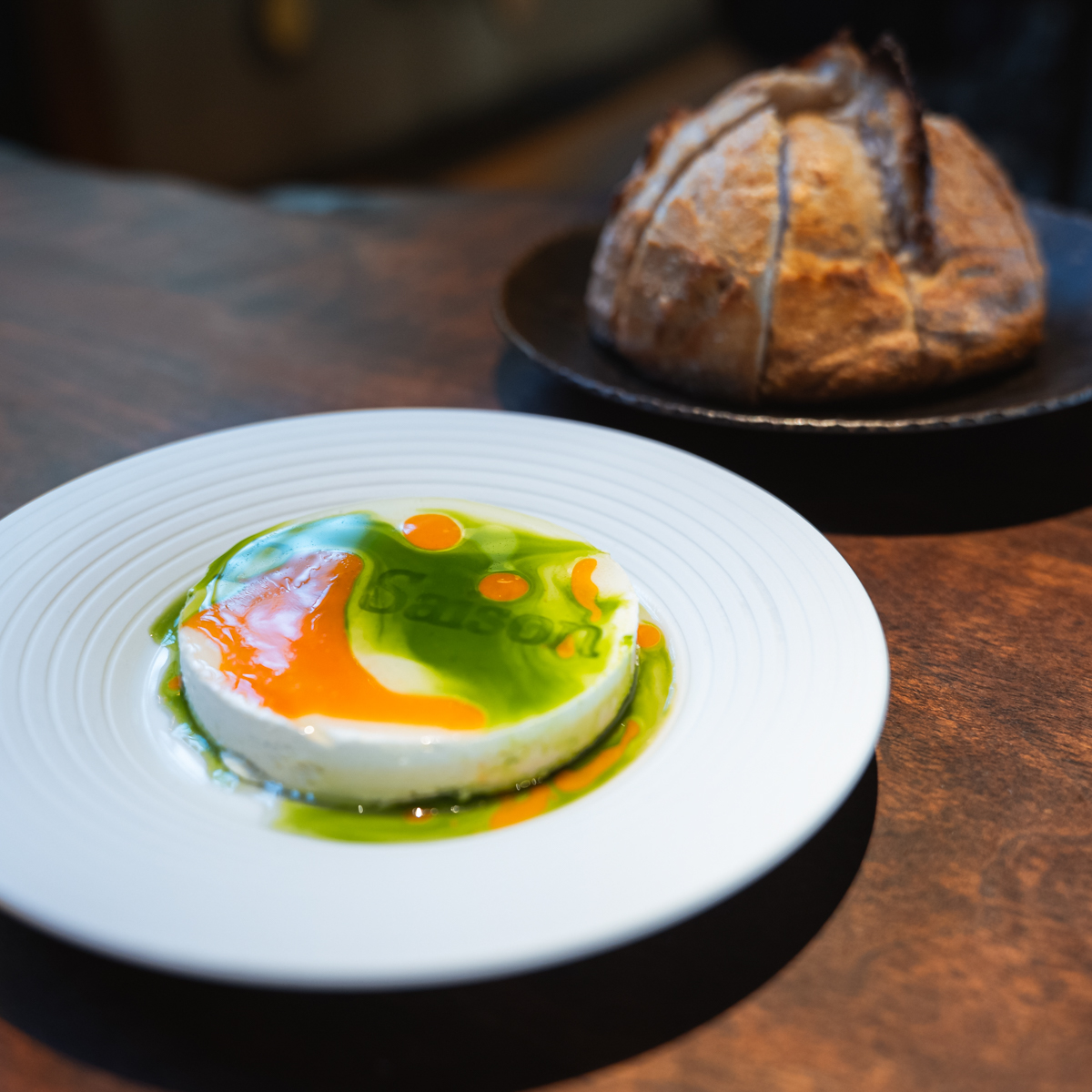 Es folgen die einfachen Freuden des Lebens: bestes Brot, Joghurtbutter, Schnittlauchöl, Rosmarin, Chili. Und dann geht's los: Artischocke als Tarte, kühl begleitet von Tomateneis mit Lorbeer und einem Tomatensalat. Dazu: „Riesling Lemonade“ von Petr Korab – einem tschechischen Pet Nat mit frischem Zitronenzest-Aroma, einer fast salzigen Mineralität und der spielerischen Leichtigkeit eines Hochsommertags. Beides – Wein wie Gericht – wie ein wie ein flirrend heißer Nachmittag im Schatten eines Zitronenbaums.