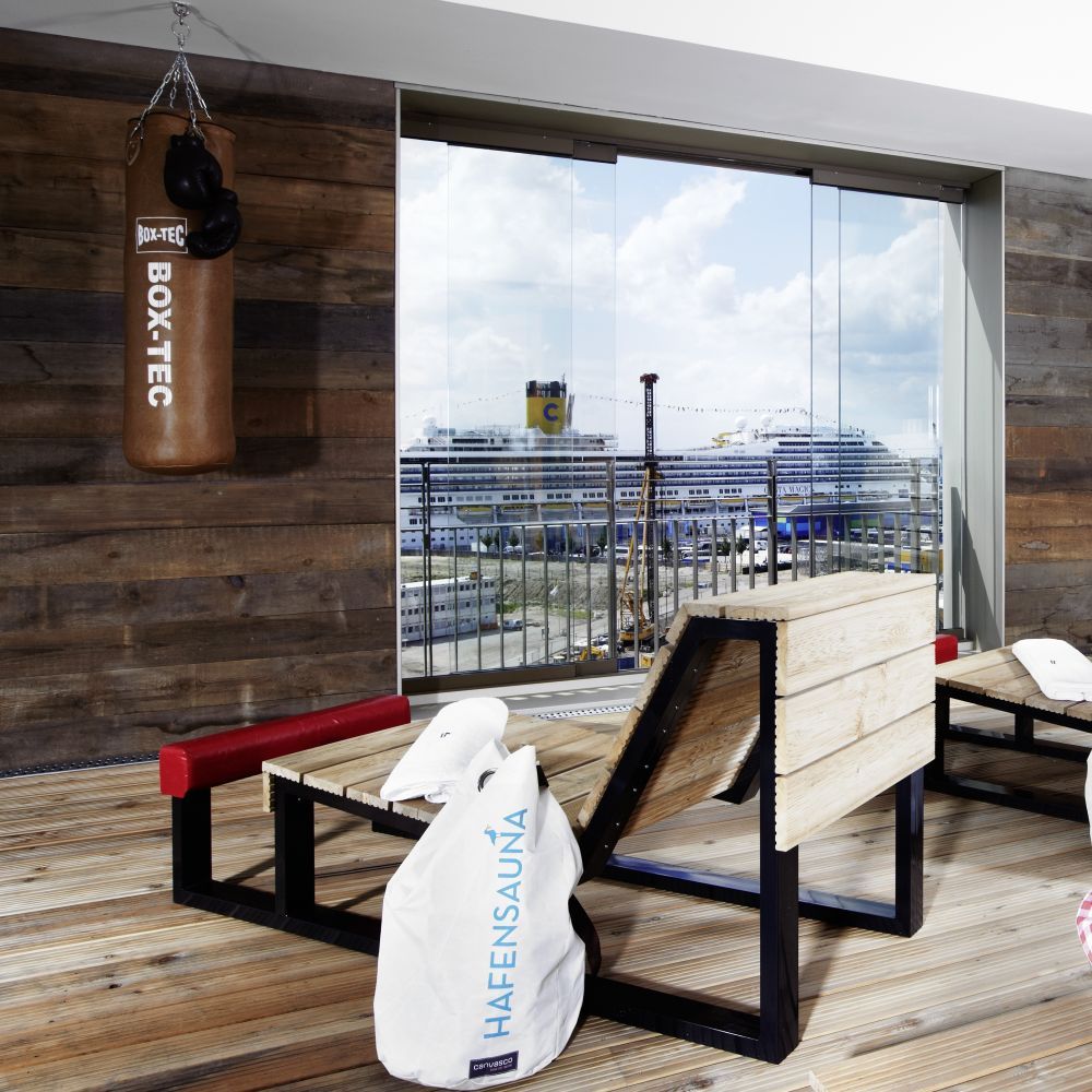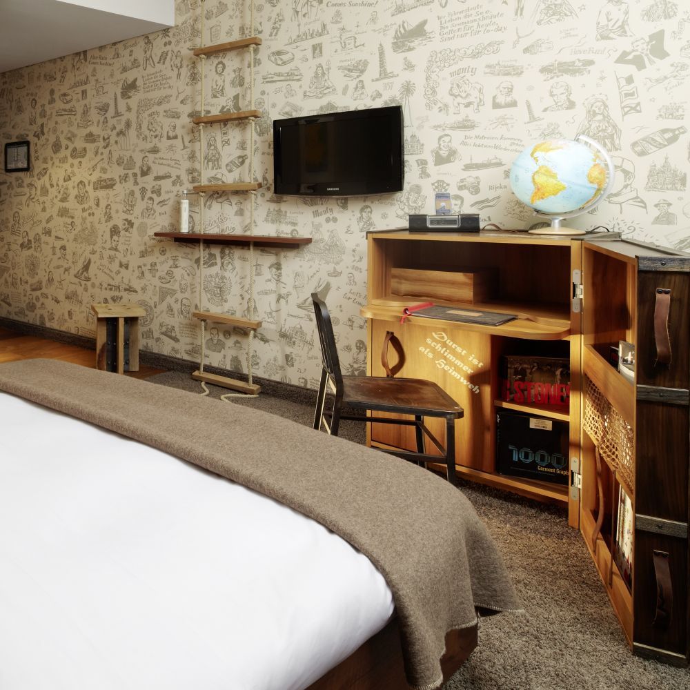 Den Weg zur eigenen Koje weisen an Containerterminals erinnernde Bodenmarkierungen und Schiffslampen, von denen man fast erwartet, dass sie zwischendurch anfangen zu flackern. Im Zimmer dann Anker-Wandtattoos, eine als Sekretär umfunktionierte Seekiste inklusive Minibar (mit der lustigen Aufschrift: „Durst ist schlimmer als Heimweh“) und eine Strickleiter, die so auch an einem Schiffsbauch baumeln könnte. Bevor ich mich aufs Bett werfe, greife ich nach dem „Logbook“ und blättere mich durch Seemannsgeschichten und die persönlichen Hamburg-Tipps des Hotelteams.
