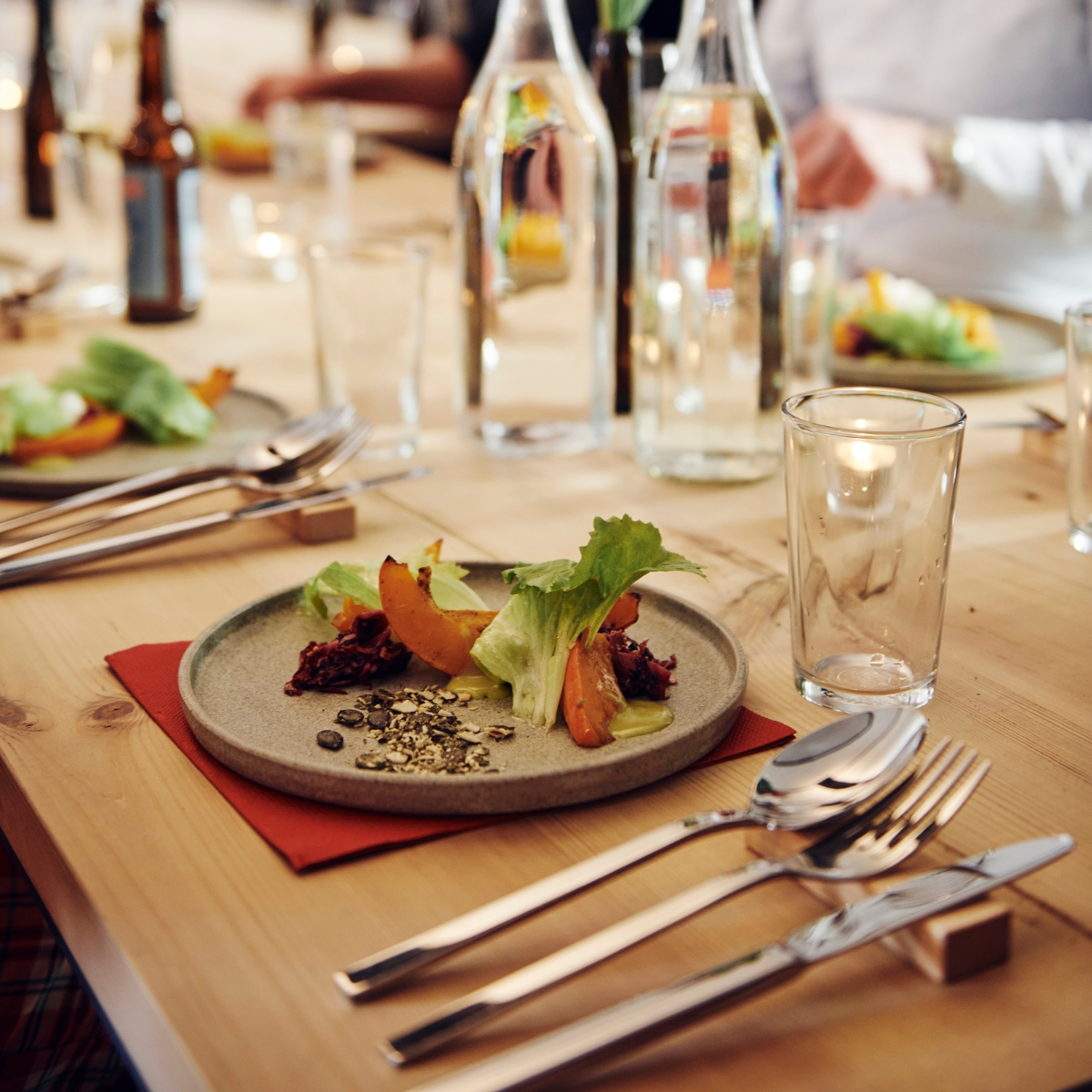 Bereichernd wie das Menü gestaltet sich auch die Begegnung mit unseren Tischnachbar*innen. Während des gemeinsamen Essens entspinnen sich anregende Gespräche über das, was auf unseren Tellern liegt und das Leben im Allgemeinen. Die Menüs des Schmiededinners und des Nimm Fünf bestehen ausschließlich aus Produkten von Produzent*innen, die vom Team der Alten Schmiede sorgsam ausgewählt wurden.