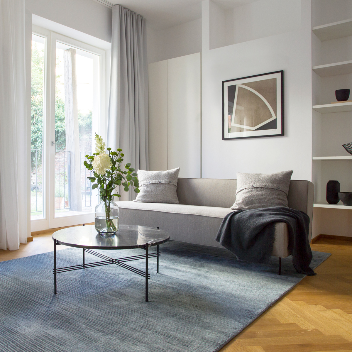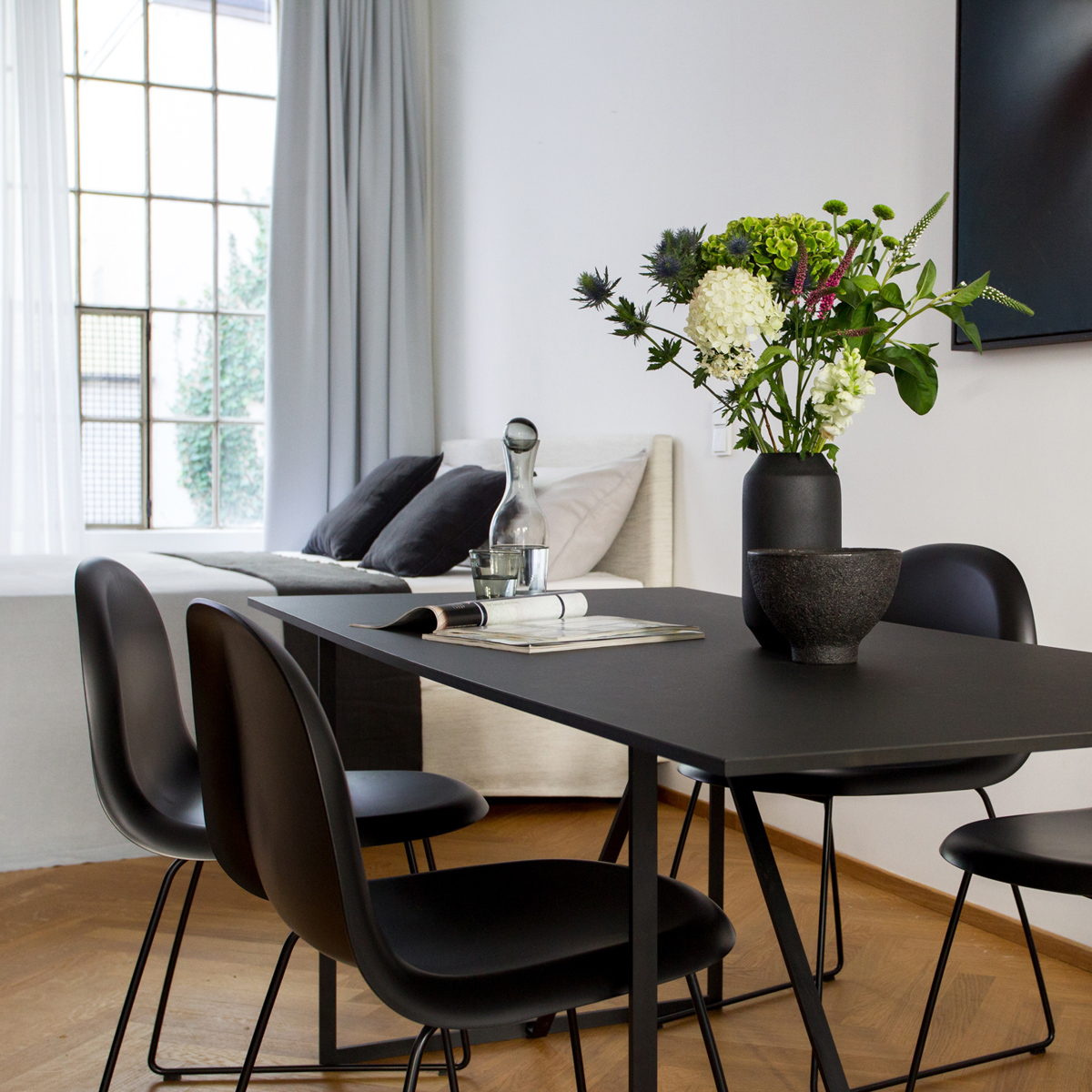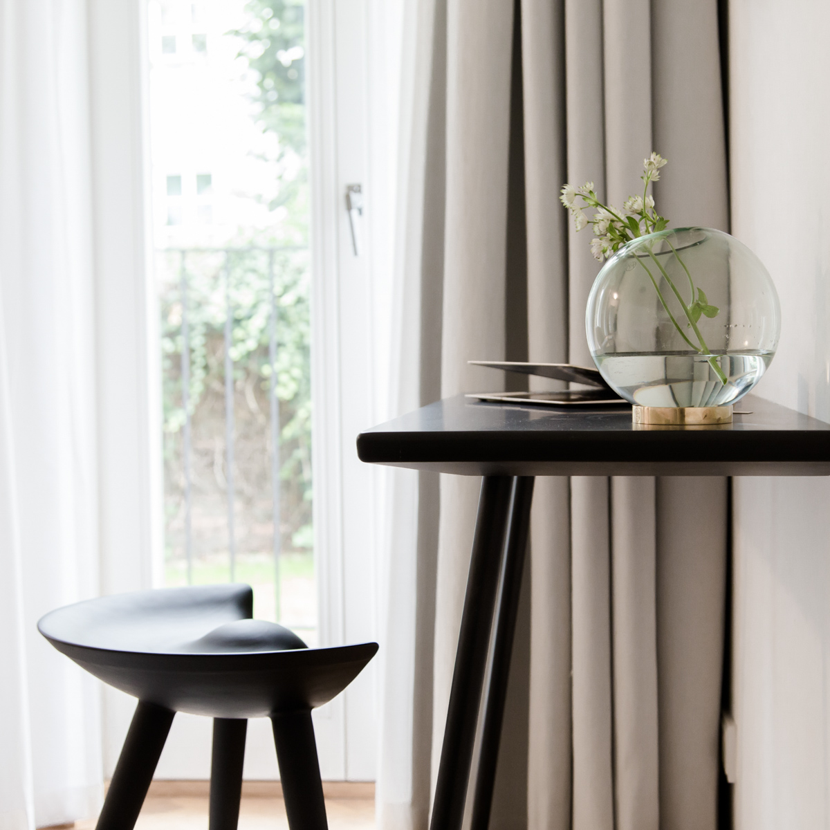 Auch das Farbkonzept der Apartments ist klar durchdacht, in ruhigen gedeckten Nuancen gehalten und im Zusammenhang mit den luftigen Vorhängen stellt sich sofort ein behagliches Gefühl ein. Der stilvolle Mix aus Möbeln und Accessoires in skandinavischem Design von Gubi, La Petit Friture und Menu vervollständigen das runde Konzept.