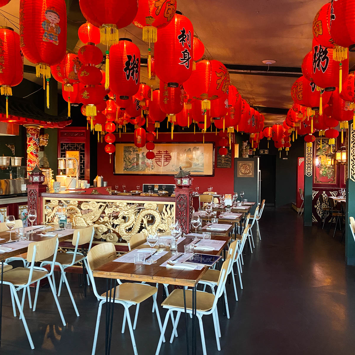 Die schummrige Beleuchtung im chinesischen Stil setzt sich oben im Restaurant fort: Über und über ist die Decke von den roten Lampions bedeckt, die für eine angenehme, gedämpfte Lichtstimmung sorgen. Ansonsten geht es in dem neuen Restaurant lebendig zu. Der Service serviert den vielen Gästen flink und freundlich diverse blau-weiß gemusterte Schälchen voller Köstlichkeiten und in der offenen Küche kann man die Köche beim kunstvollen Dumplingsfalten bewundern.