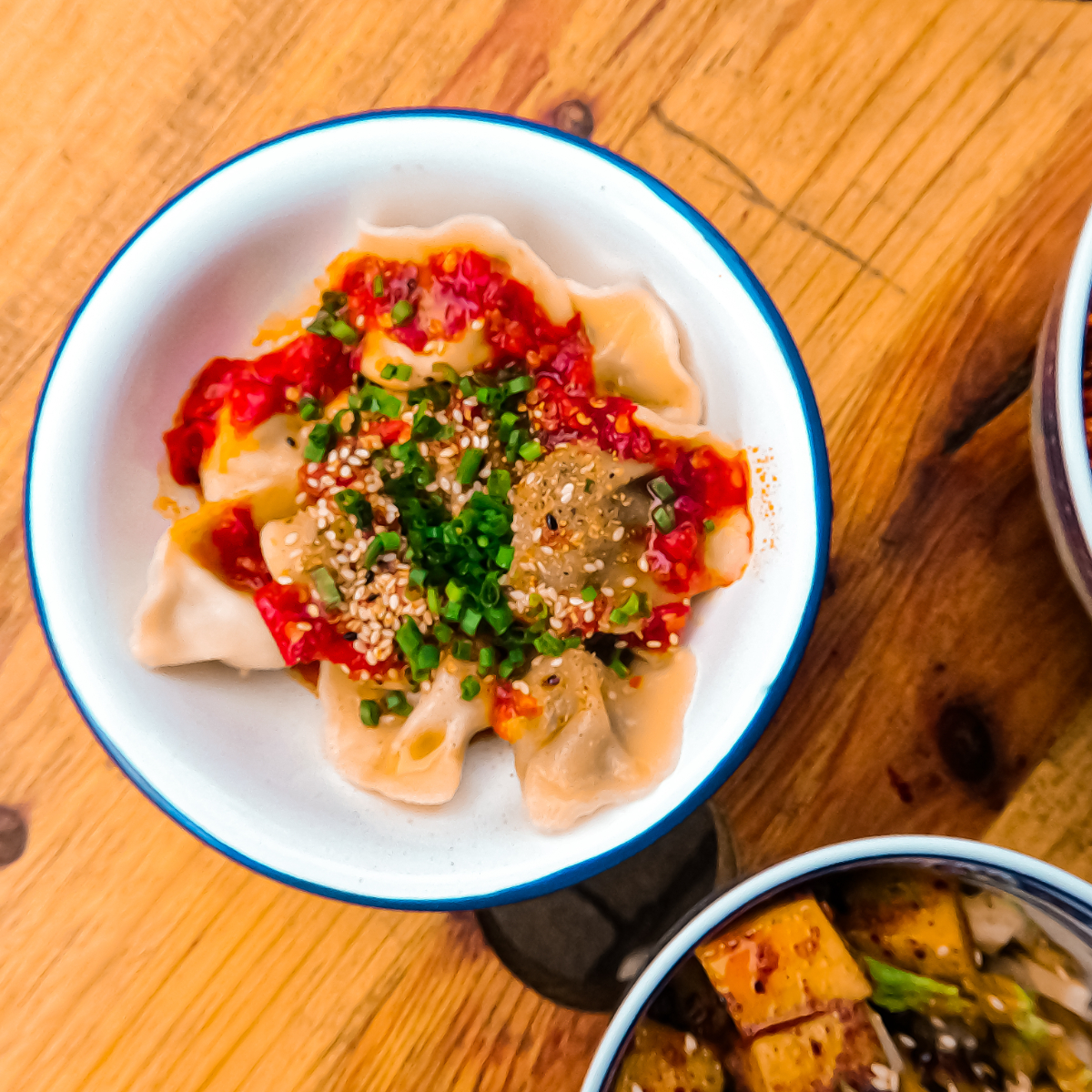 Durch die typischen Gewürzmischungen der Sichuan-Küche werden auch die Liebhaber:innen von Fleisch und Fisch hier glücklich und satt. Wir genießen die luftigen Dumplings mit Kartoffelfüllung in einer Soße nach Zhong Art, dazu mundet eine Polenta mit scharfer fermentierter Chili- und Sojabohnensoße.