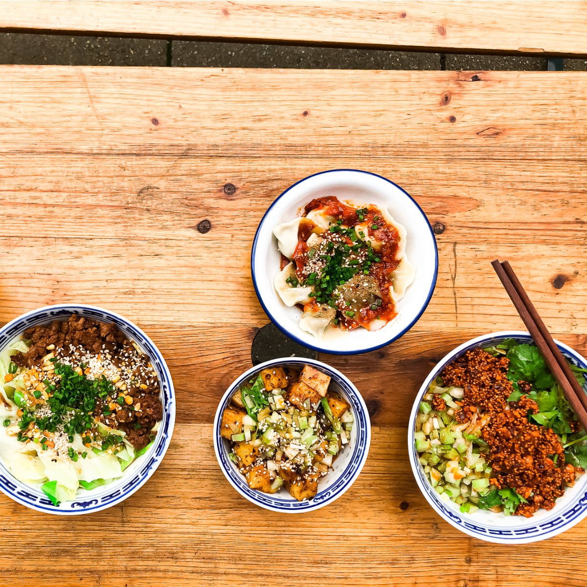 In einer weiteren Schale dampfen Udon-Nudeln mit Spicy Peanut Soße. Auf die gerösteten Peanuts mit Chili und Kreuzkümmel drapiert Fan noch etwas gerösteten Amaranth und dazu frische, kühle Korianderblätter. Auch die marinierten Nudeln nach Dan-Art mit frisch gehacktem Schnittlauch, Sesam und veganem Hackfleisch schmecken frisch und köstlich. Die Mini-Dumplings in Chilisoße und duftenden Kräutern machen uns glücklich. Wir kommen bald wieder.