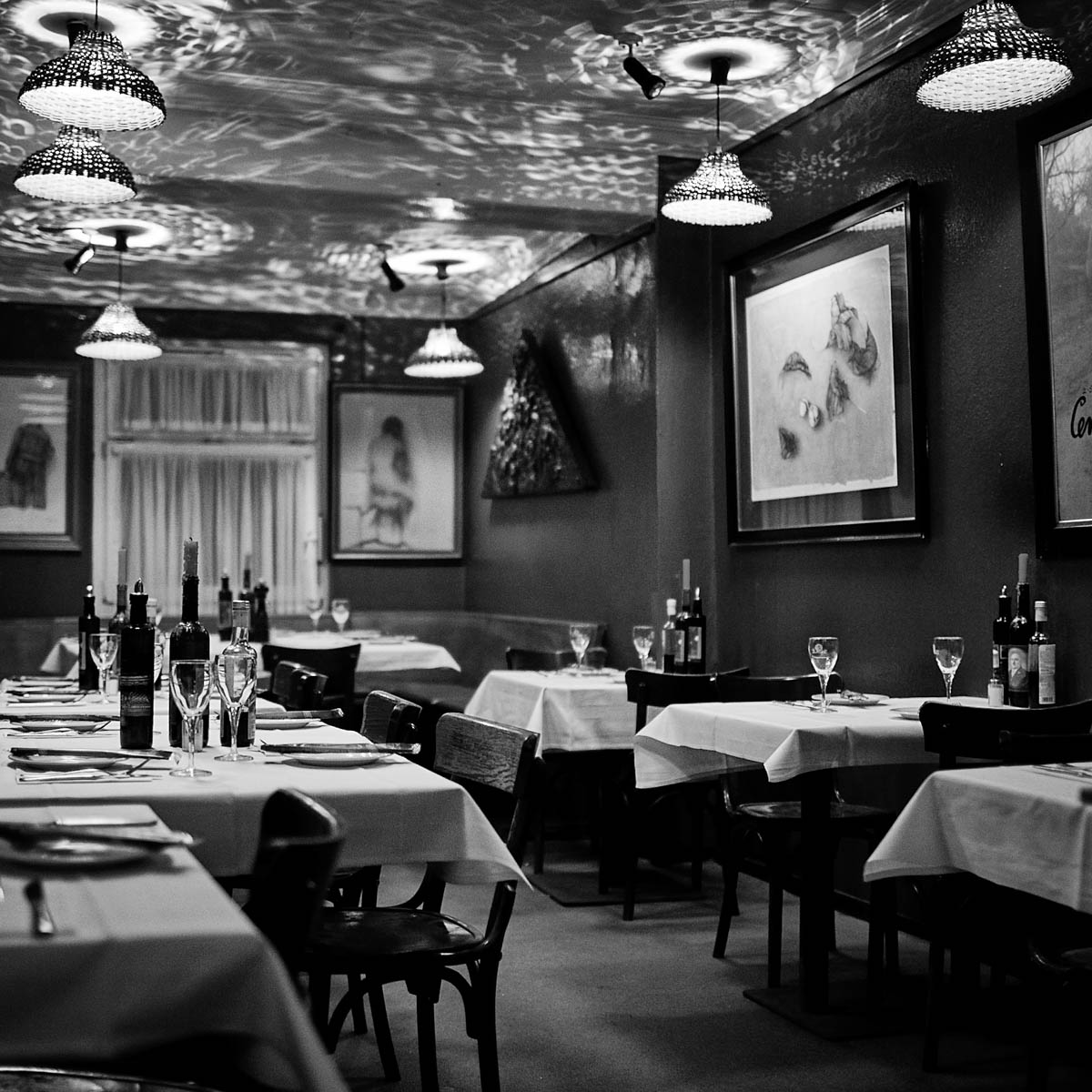 Von außen unscheinbar, verbirgt sich im Innern des ehemaligen Bordells ein gemütlich-stilvoller Gastraum: An den weinroten Wänden hängen Kunst und Bilder bekannter Künstler, prominenter Gäste und der Familie. Kerzen in Weinflaschen beleuchten die weiß eingedeckten Tische und die legendäre Musikbox sorgt für Flair.