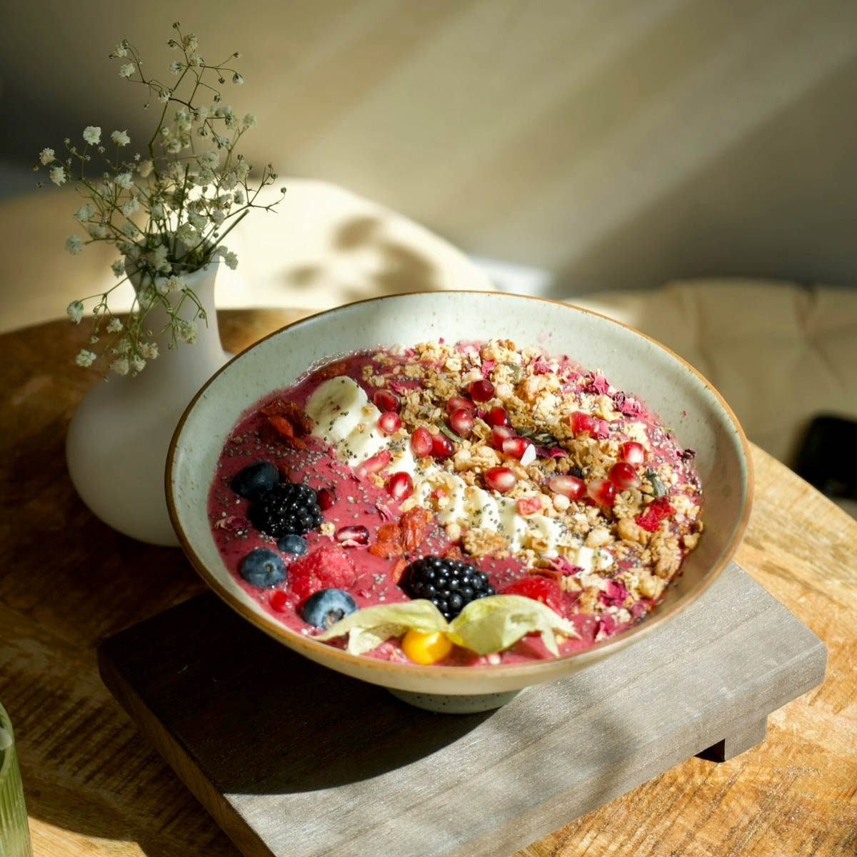 Auf dem Teller, in der Schüssel begegnen sich Asien und Europa. Und zwar auf sehr kreative Weise, auch bei den Namen. Die „Rosengarten Bowl“ beispielsweise: Waldbeeren, Bio-Açai, Granatapfel, gefrorene Banane, Granola und Chiasamen, es klingt so gut und vitaminreich, wie es schmeckt. Veredelt mit Bio-Rosenblättern. – Bitte noch eine weitere dieser Superfood-Bowls.