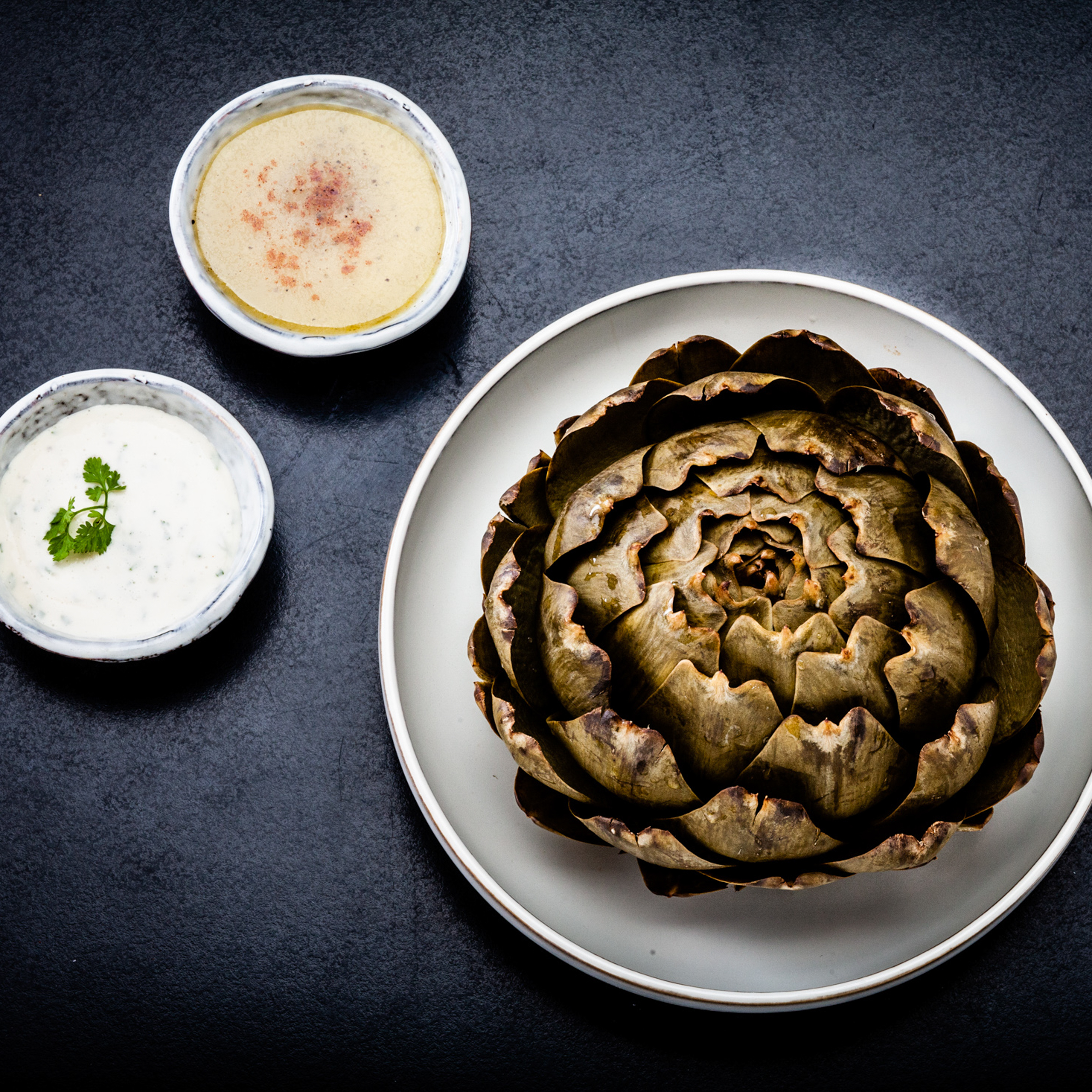 Weiter geht der Trip. Auf unseren Tellern glänzt eine Bretonische Artischocke zu der Estragon-Vinaigrette & Balsamico-Mayonnaise gereicht werden. Köstliches, einfach-raffiniertes Essen. Die Artischocke dient im Carmagnole übrigens nicht nur als nährende Köstlichkeit, sondern auch als Namensgeber und Logo.