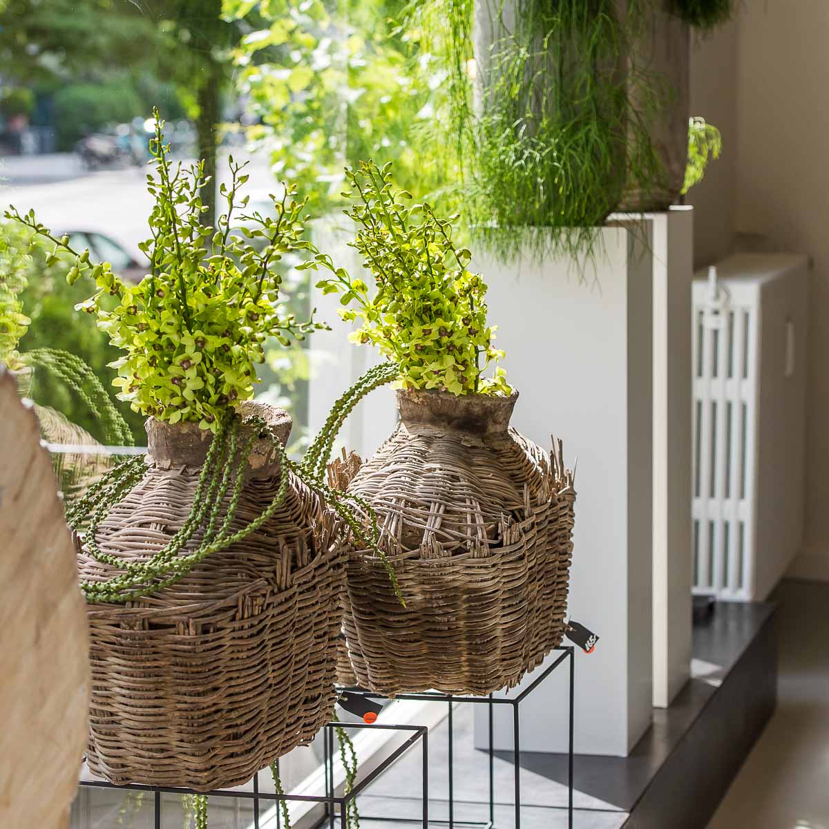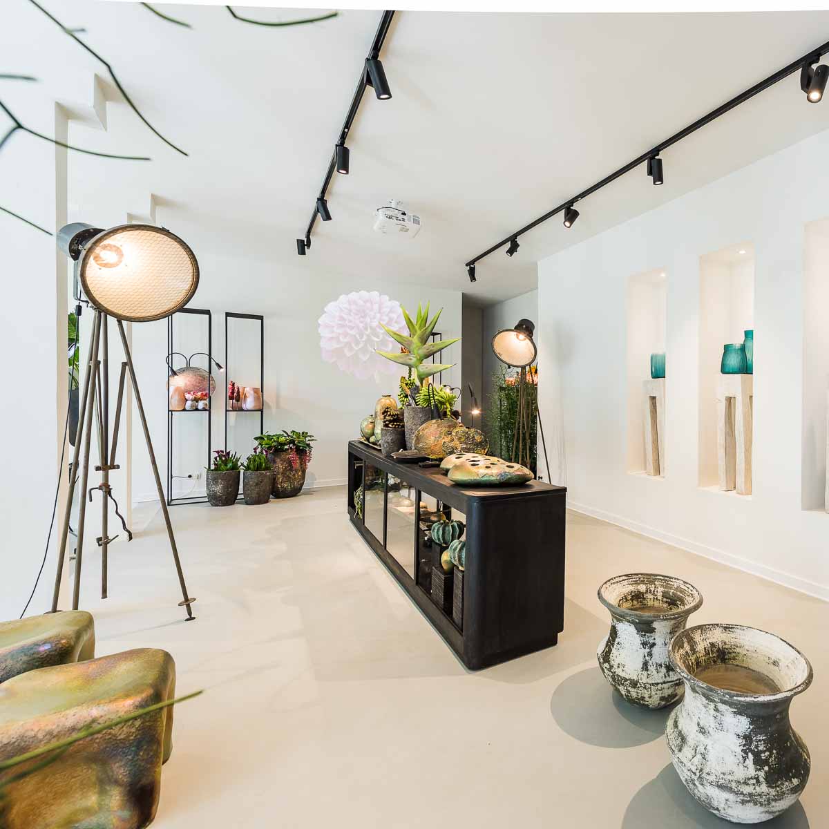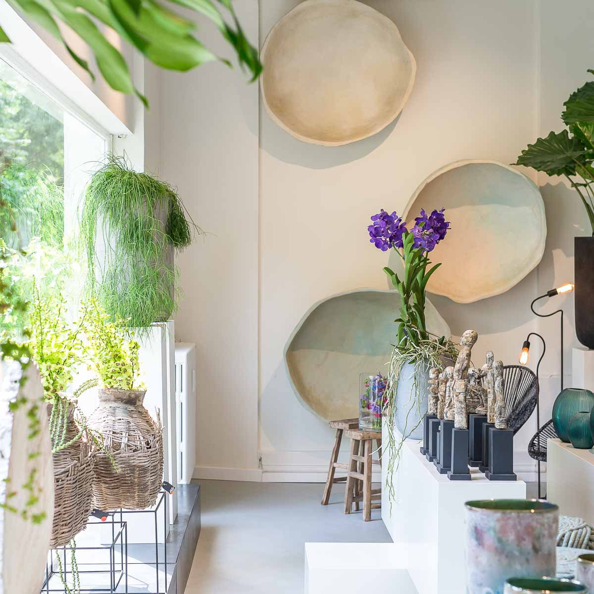 Kurz stellt sich die Frage, ob wir in einem Studio für Inneneinrichtung gelandet sind – der Blick bleibt an Skulpturen, Keramikarbeiten und außergewöhnlichen Gefäßen haften, bevor er weiter in die Ecke mit den Schnittblumen wandert.