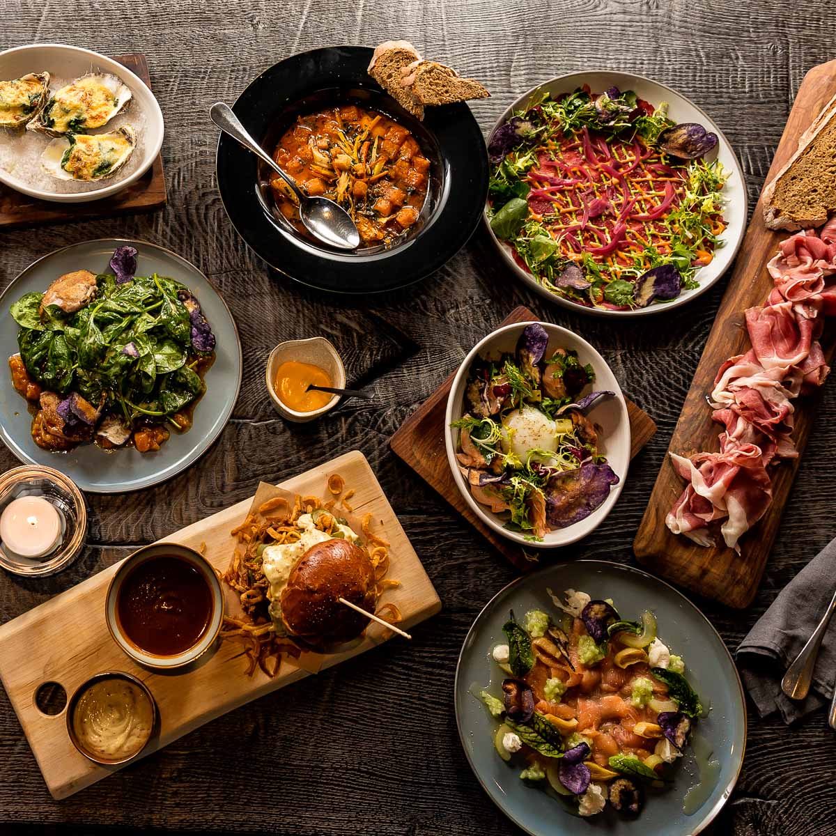 Kaum haben wir vom Sauerteigbrot mit kaltgeschlagener, gesalzener Fassbutter gekostet, landen schon die üppigsten Vorspeisen vor uns auf dem Tisch. Krosse Pastrami-Stulle, feinstes Tatar vom Weiderind, warmer Gemüsestrudel, würzige Fischsuppe und gemischte Blattsalate. Dazu Sauvignon Blanc und Spätburgunder Rosé – auch die Weinkarte lässt hier keine Wünsche offen.