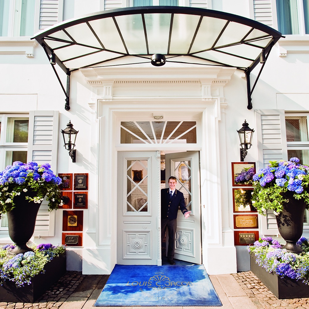 Zu besonderen Anlässen durfte ich bereits in den Genuss von Thomas Martins Sterneküche kommen, doch heute wird kein Geburtstag gefeiert und auch die Tageszeit ist ungewöhnlich. Statt auf die sich am Abend in der Elbe romantisch spiegelnden Lichter des Airbus-Areals, blicken wir jetzt in der Mittagssonne auf die berühmte Lindenterrasse des Louis C. Jacob Hotels. Wir gratulieren uns zu der grandiosen Idee, ein Sterne-Menü am helllichten Tag zu genießen und freuen uns auf einen wunderbaren Auftakt.