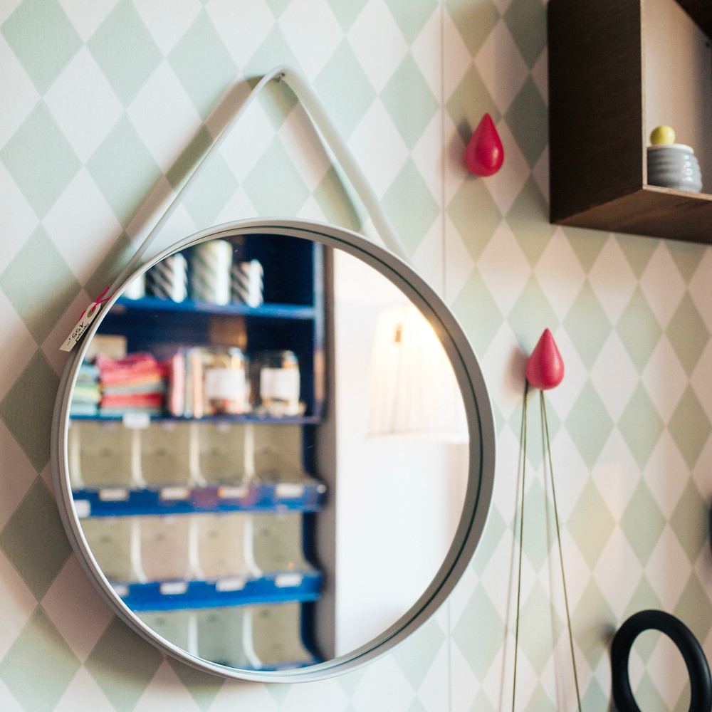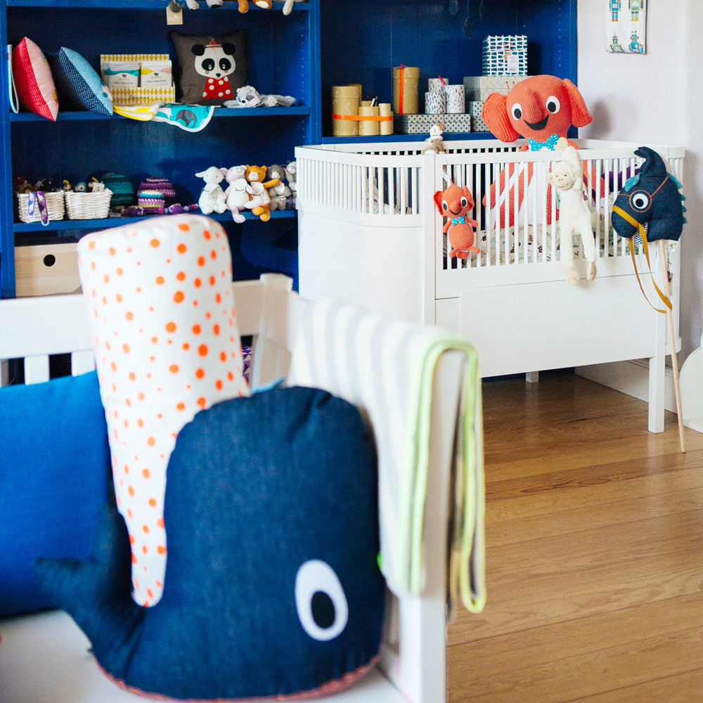 Bis auf ein paar vergnügte Stofftiere aus England, stammt alles aus Skandinavien. Kerzenständer von Oyoy, Holzhaken von Normann, Kissen von Place de Bleu, Geschirr von Green Gate. Keine schwedische Landhausromantik, kein Kitsch, sondern modernes Design, grafische Muster, farbenfroh und trotzdem cool.