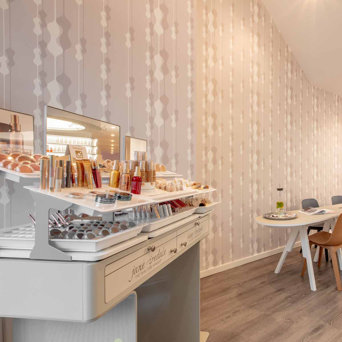 Sie trägt eine weitere Schicht Vitamin A-Pflege auf und entlässt mich aus dem kuscheligen Nest des Behandlungsstuhls. Meine Haut fühlt sich prall und frisch an, sie erstrahlt wie neu. Ich bin begeistert und komme nun in den Genuss eines Tages-Make-ups mit den Produkten von Jane Iredale– einer Linie aus mineralischen Inhaltsstoffen, ohne künstliche Duft- und Konservierungsstoffe.