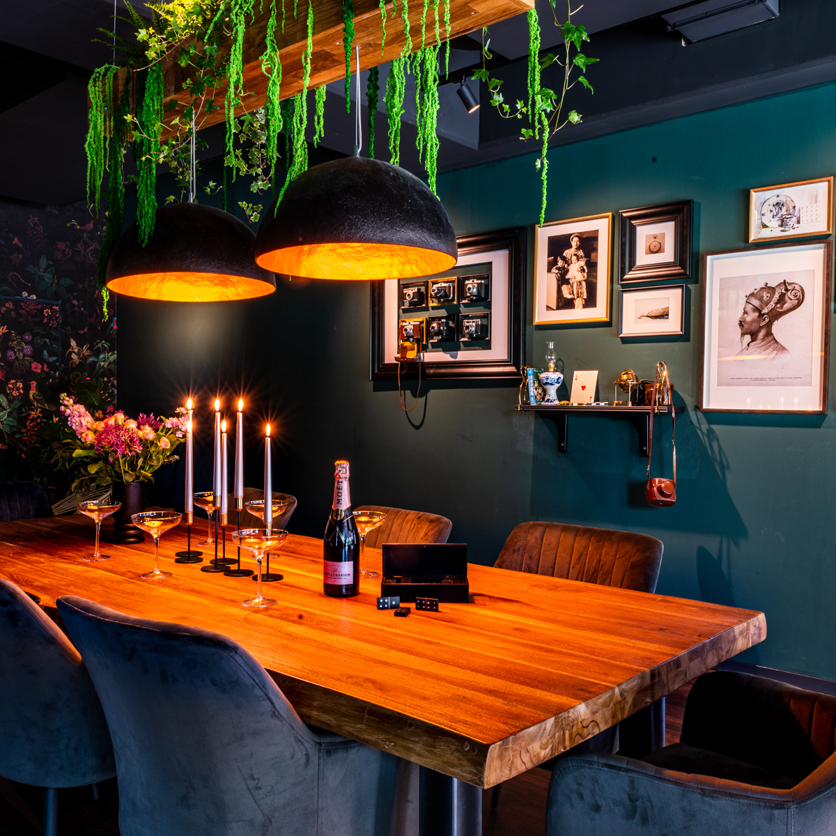 Ein gelungener Materialmix, der durch Motivtapeten an einigen Wänden und auf runden Elementen, die vor der Decke zu schweben scheinen, ergänzt wird. So wird aus einem eher gesichtslosen Ecklokal in einem Neubau ein Restaurant mit Atmosphäre.