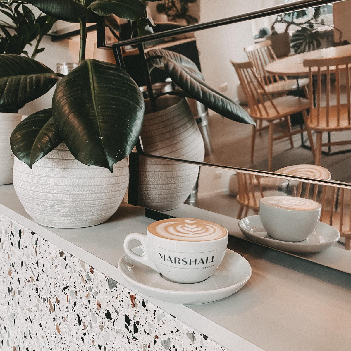 Cleane Tische und Stühle aus hellem Holz, viel Terazzo und hier und dort ein paar Grünpflanzen, die für ein gutes Raumklima sorgen. In der kleinen Vase auf dem Tisch verströmt ein Eukalyptuszweig diesen Duft, der einen kurz direkt in den australischen Busch versetzt. Im Marshall Street in der Hamburger Altstadt wähnt man sich nicht in der Hansestadt, Ein wenig sieht es aus wie in Berlin – oder vielleicht wie in Sydney?