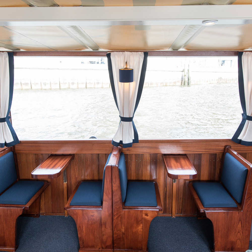 Ganz im Salon-Stil eingerichtet, erstrahlt das fast 70 Jahre alte ehemalige Arbeiterschiff im neuen Glanz. Edles Mahagoniholz, Messing-Elemente und blauer Samt verleihen der Barkasse ihren maritimen Charakter und lassen sofort die Handschrift des Louis C. Jacob, dem schönsten Hotel an der Elbe, erkennen.