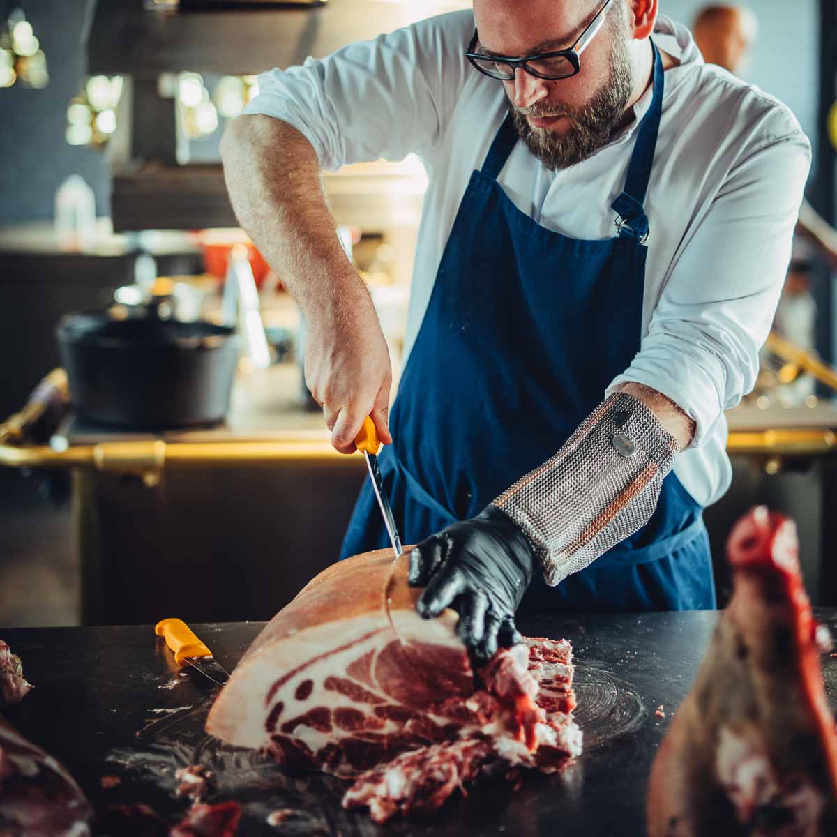 Wir starten mit einem Apéritif auf der Galerie, von der wir das Restaurant überblicken können. Herzstück ist ein imposanter Molteni-Herd, der indirekt Namensgeber des 100/200 ist: Bei 100 Grad kocht Wasser, der Ofen läuft auf 200 Grad – für Thomas Imbusch die Basis für "Essen, Emotionen und Ekstase".