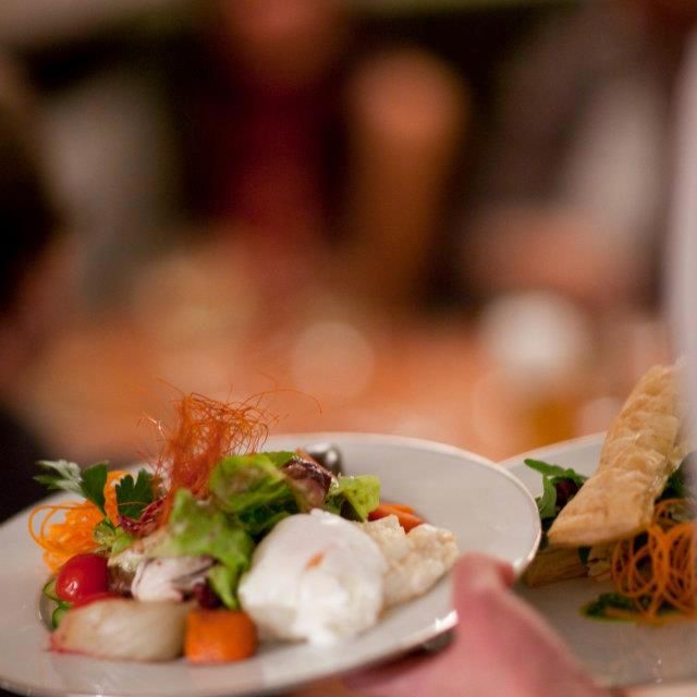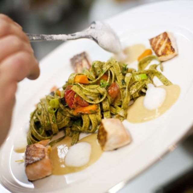 So auch die imposante Auswahl internationaler Kochbücher. Über 4.000 soll Frank Brüdigam besitzen und ein Großteil davon findet man in den deckenhohen Regalen des Restaurants. Die beste Lektüre ist hier jedoch die Speisekarte. Mediterrane Küche mit nordafrikanischem Einschlag, dazwischen ein paar Klassiker – das macht sofort Appetit.