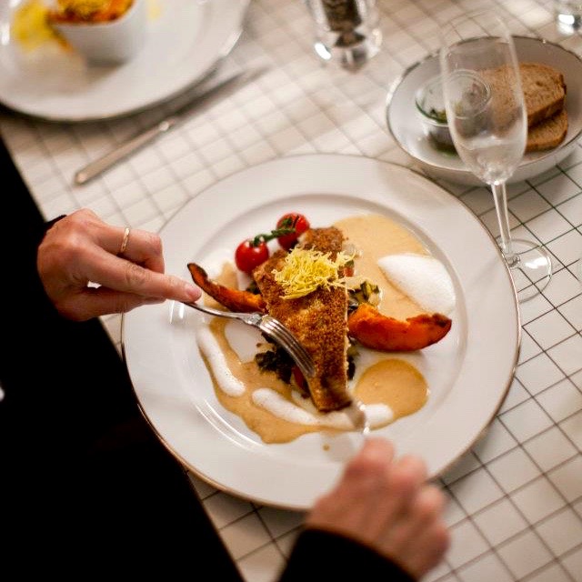 Die Hokkaidokürbis-Suppe mit steirischem Kernöl als Vorspeise ist ein echter Genuss, dazu ein badischer Grauburgunder aus dem Jahr 2015 vom Weingut Weber und wir sind eigentlich schon gänzlich zufrieden. In den absoluten Glückszustand verhelfen uns dann jedoch die Hauptspeisen.