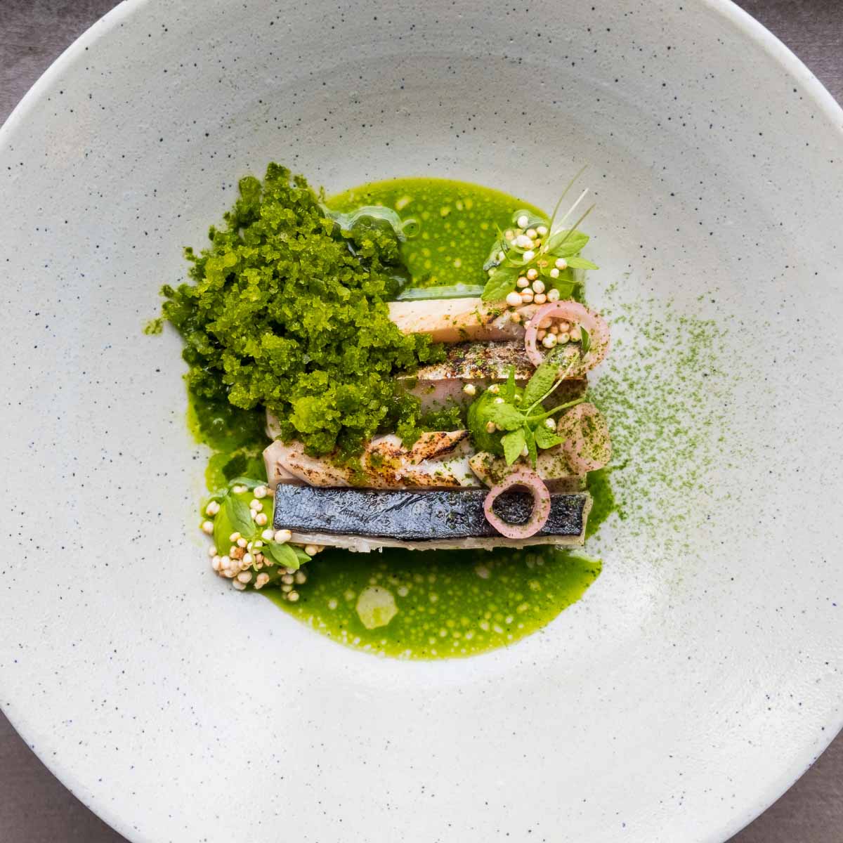 Den ersten Gang bringt Björn Juhnke selbst zu uns an den Tisch: blanchierte Erbsen, jede einzelne davon geschält für ein vollendetes Mundgefühl, wie er uns erklärt. Angemacht mit Minze und klassischer Vinaigrette, getoppt von einem crunchy Joghurtsponge und zarter Buttermilch-Granité, ist dieser Gang so cremig, nussig, sommerlich, dass wir Björns Begeisterung fürs Erbsenschälen nach anfänglicher Skepsis sehr gut nachfühlen können.