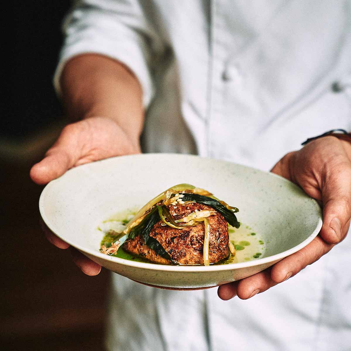 Als Björn uns wenig später seine Spanferkelbäckchen mit Sherrysauce und Püree von der Pariser Karotte präsentiert, schielen wir ein klein wenig neidisch zur vegetarischen Variante. Die Bäckchen sind ohne Zweifel ein Genuss, doch der in Butter gegarte Blumenkohl mit Vogelmiere und Blumenkohlpulver lässt das schlichte Gemüse in ganz neuem Licht erscheinen und schafft es, auch überzeugte Fleischesser für die pflanzliche Hausmannskost à la Haco zu begeistern.