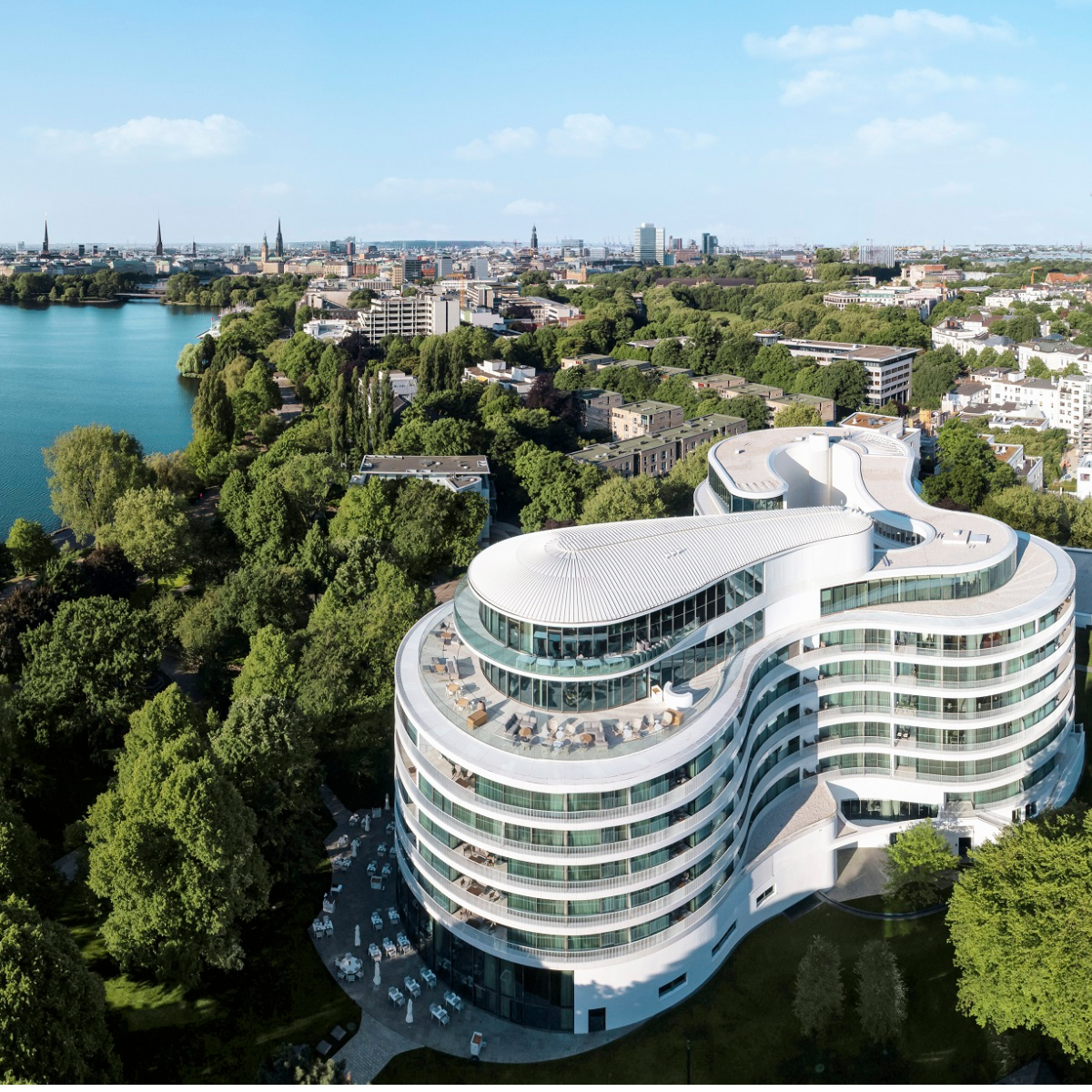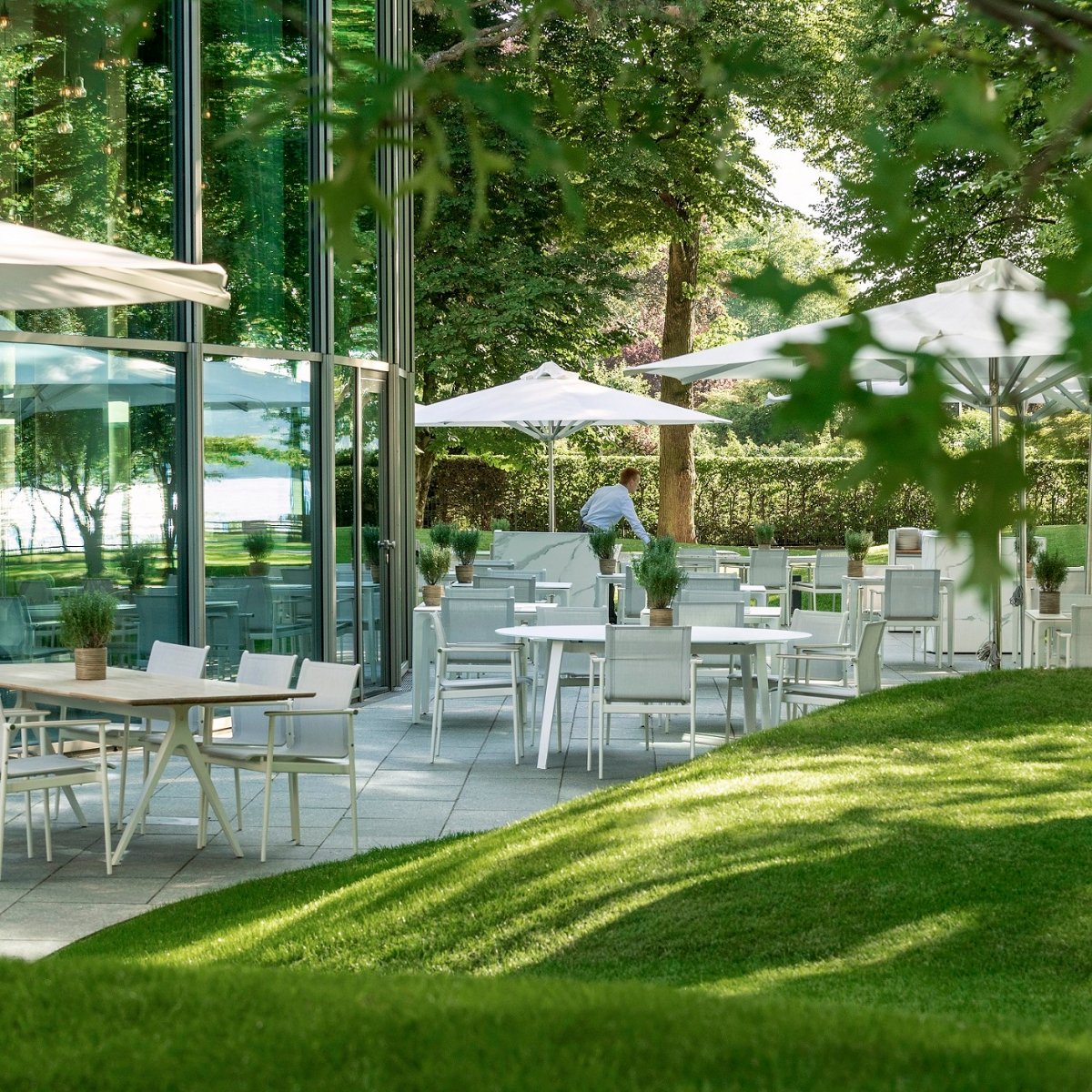Nicht nur die herrliche Sommerterrasse und der traumhafte Blick auf die Alster laden zum Verweilen ein. Sogar bei typisch grauem Hamburg-Wetter transportiert das Gartenrestaurant positive Schwingungen, indem die Parklandschaft durch die große Fensterfront und die lichte Höhe der Decken ins Innere des Parkview Restaurants hereingeholt wird. Das Draußen, die Luftigkeit, die Alster, reflektieren sich in Material und Farben des Restaurants; das Grün der Onyx-Wände zollt dem schönen Landschaftspark, den altehrwürdigen Bäumen Rechnung.