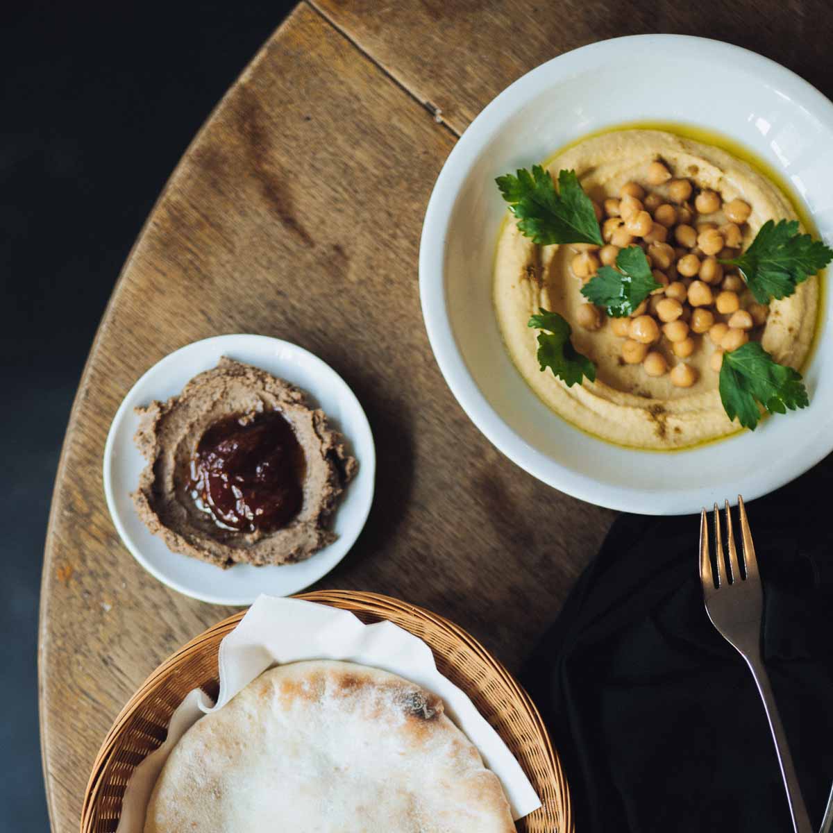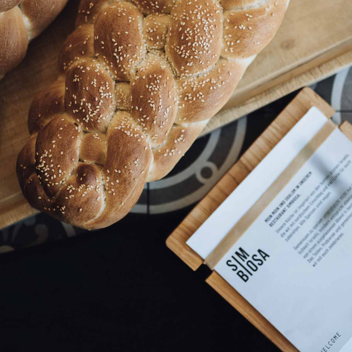 Eine ebenso überraschende wie gelungene Geschmackskomposition, die uns umso neugieriger macht auf die nun folgenden Mezze – kleine köstliche Häppchen, die im Simbiosa ausdrücklich zum Teilen gedacht sind. Zu den Dips aus gegrillten Auberginen oder drei Stunden gekochten Tomaten, Sesampaste mit Zitrone, israelisch gewürztem Frischkäse und Linsenpastete mit karamellisierten Zwiebeln und Kirschtomatenmarmelade genießen wir hausgebackenes Brot.