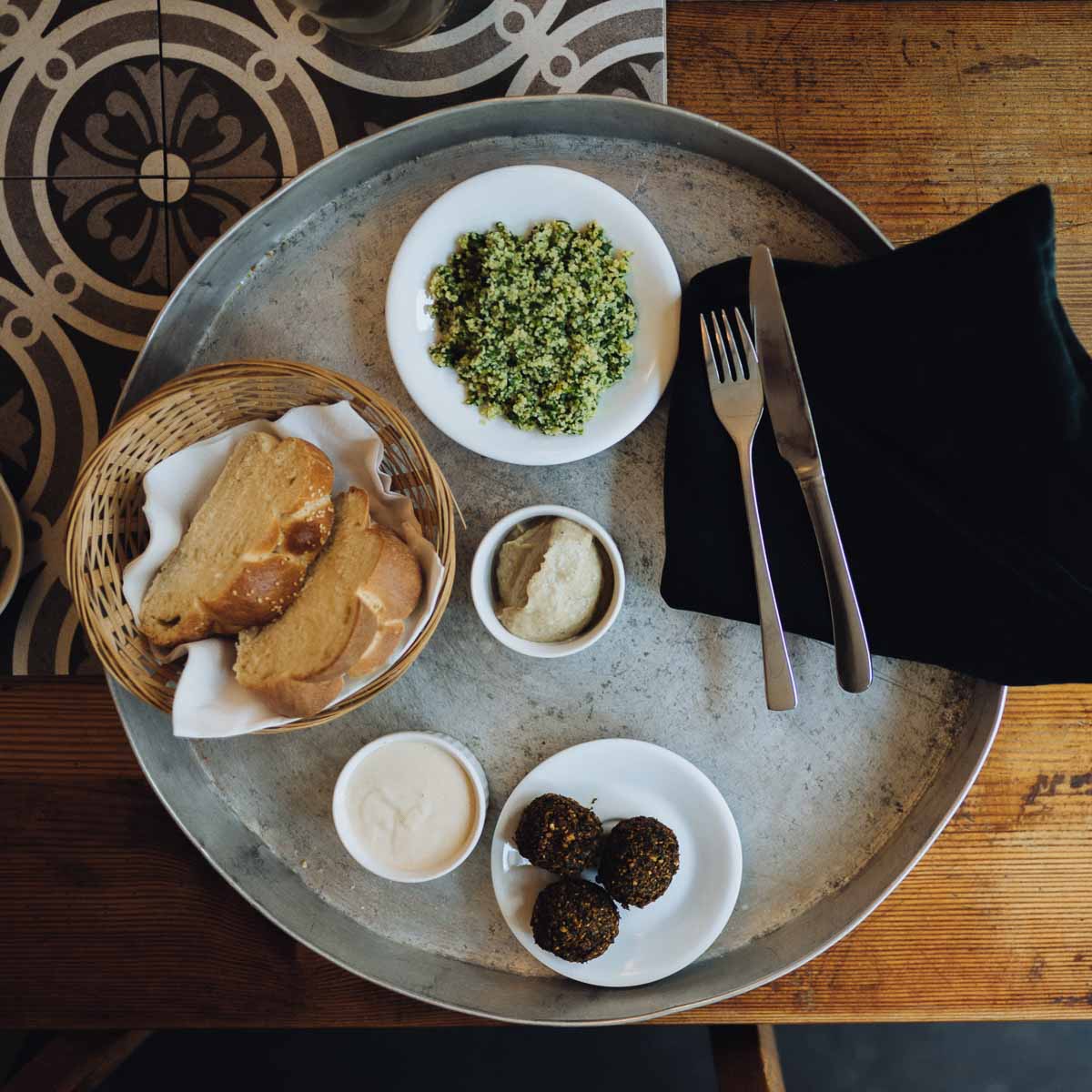 Das Restaurant ist gut besucht an diesem Samstagabend. Wir bekommen einen Tisch am Fenster mit bestem Blick auf die Bar – das vielversprechend bestückte Herzstück im Eingangsbereich. Hier fließt Törnqvist-Kaffee durch die Siebträgermaschine und unter anderem israelischer Arak in die Drinks. Wir starten mit einem “Welcome to Tel Aviv”, einem Aperitif, der neben besagtem Anisschnaps aus Minze, Limette und Ginger Beer besteht.