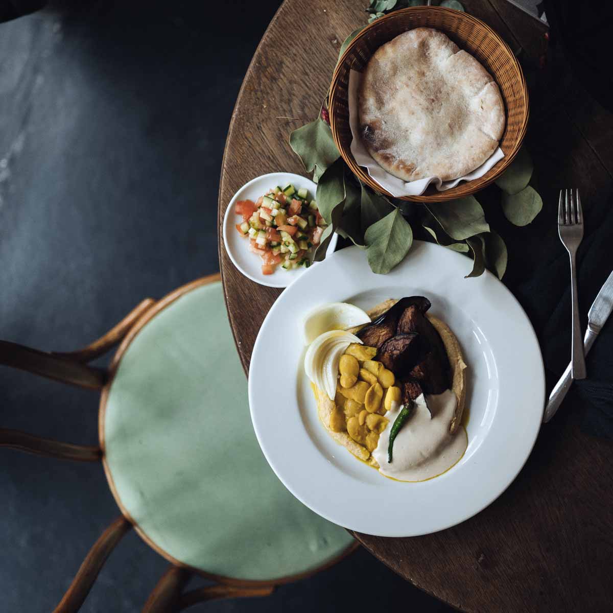 Dazu gibt es weiterhin mit vielen frischen Kräutern und Knoblauch gefüllte Falafel sowie gegrilltes Gemüse. Wir sind uns einig, dass ein Hauptgang diese Geschmacksvielfalt kaum toppen können wird – und dass wir im Simbiosa auch als Nicht-Veganer keineswegs Fleisch oder tierische Zutaten vermissen. Am liebsten würden wir jeden einzelnen der kleinen Teller ablecken, beschränken uns aber darauf, sie mit den letzten Brotkrümeln sauber zu wischen.