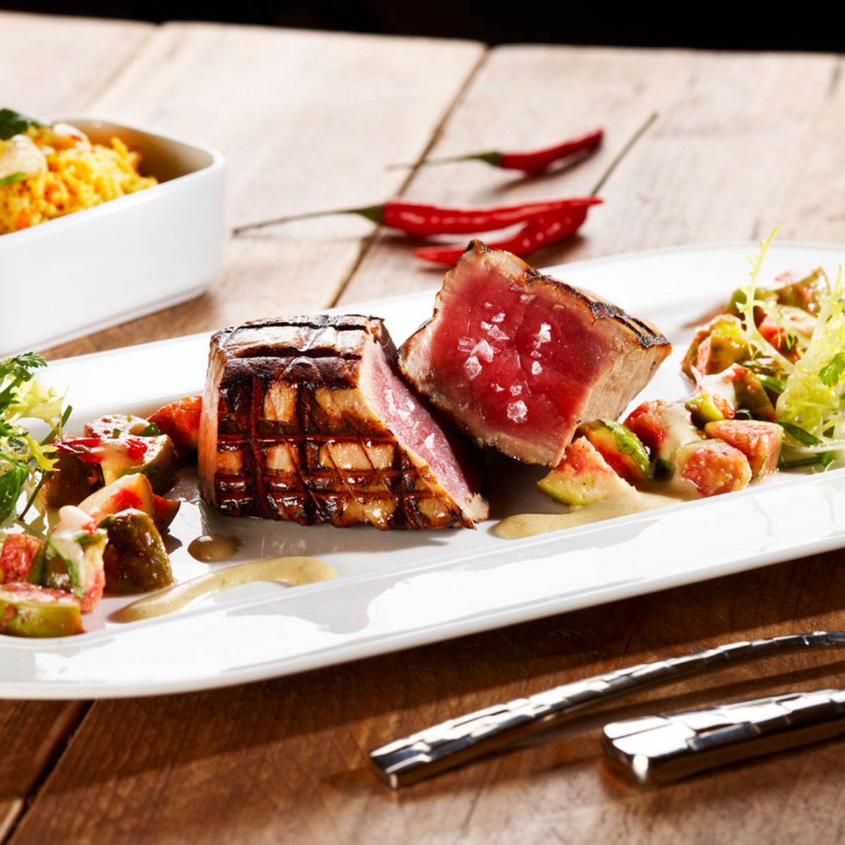 Durch die großen Fensterfronten scheint die Sonne über die großzügige Terasse in den Innebereich. Besonders in der Abendsonne schafft das Licht mit den hellen Tönen der Möbel ein gemütliches Ambiente. Die Inneneinrichtung ist schlicht, schick und modern durch die Lautsprecher tönt softe Elektromusik. Durch große Scheiben können die Gäste den Köchinnen und Köchen bei ihrer Arbeit zuschauen und den Lavasteingrill bestaunen.