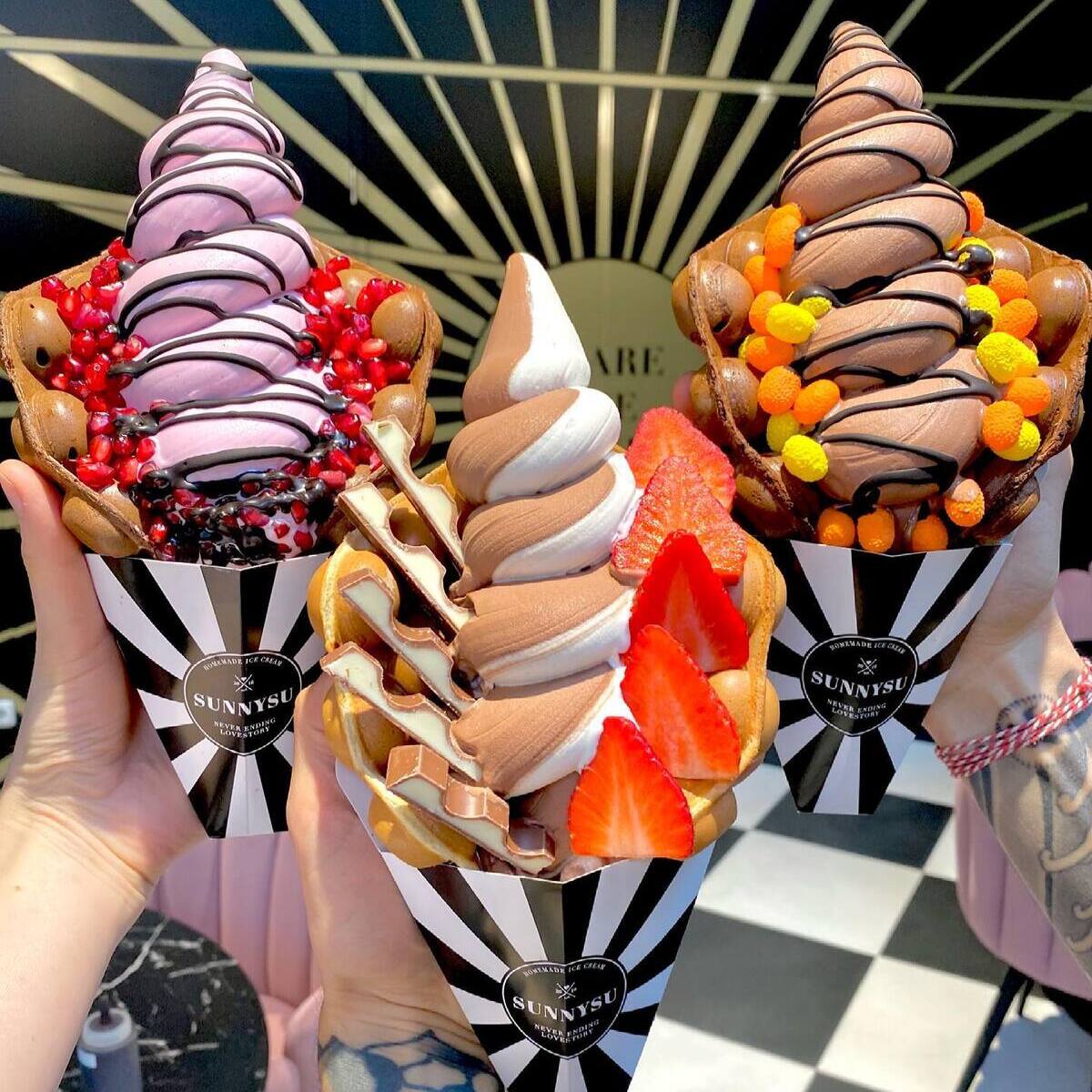 Gefüllt mit Softeis werden die sogenannten "Bubble Waffles" zur zuckersüßen Kalorienbombe. Aber es lohnt sich! Denn nicht nur beim Teig können wir unserem persönlichen Geschmack freien Lauf lassen, auch bei der Wahl der Toppings sind der Fantasie keinerlei Grenzen gesetzt. Jede Waffel lässt sich mit Früchten, Soßen, Puffreis sowie jeder Menge weiterer Zutaten upgraden. Auch für Veganer:innen ist Sunnysu mit den "Bubble Waffles" ohne tierische Inhaltsstoffe plus veganem Frozen Yogurt on top die richtige Anlaufstelle.