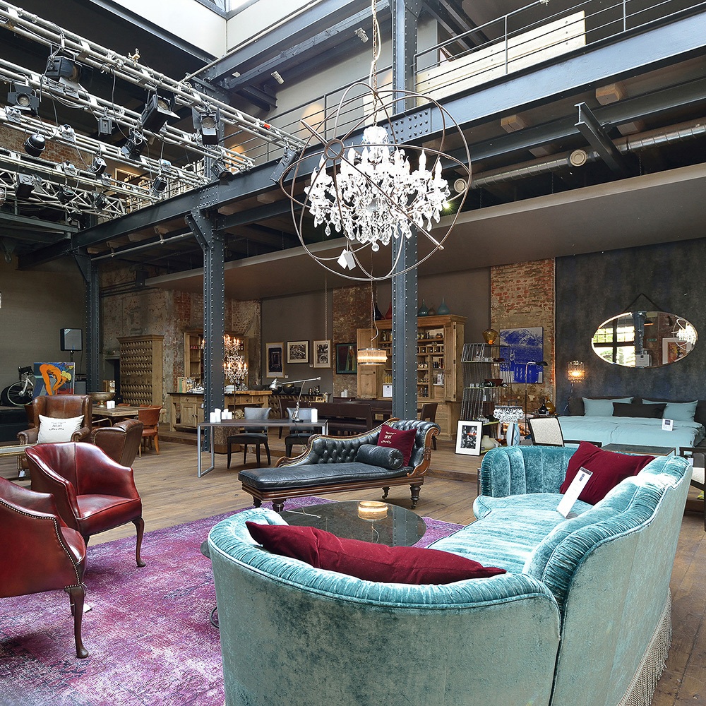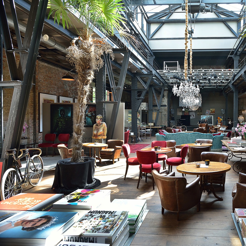 Ich werde begrüßt von fünf großen Holztischen, auf denen eine ordentliche Auswahl schönster Bildbände bekannter Fotografen, Künstler und Musiker, sowie Kochbücher drapiert sind. Schon allein hier könnte ich Stunden stöbern. Wenn da nicht noch so viel anderes zu entdecken wäre! Mir hat es gleich ein türkisfarbenes Samt-Sofa von George Smith aus dem Soho-Haus in Berlin angetan.