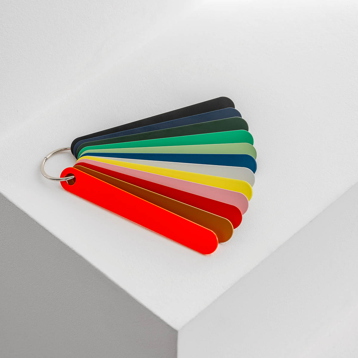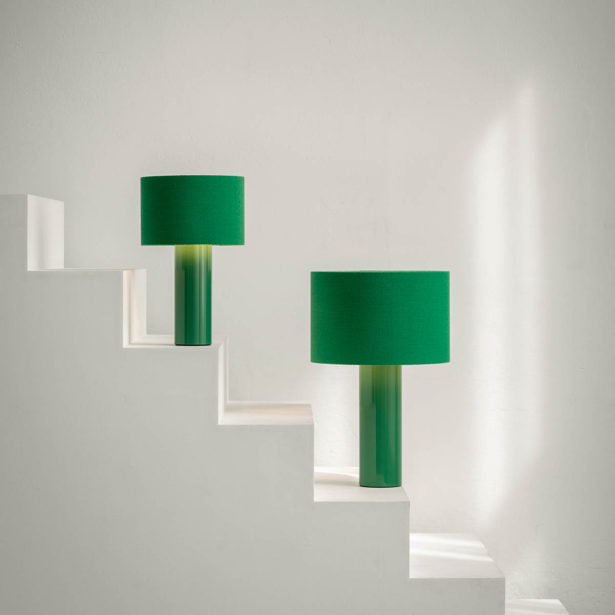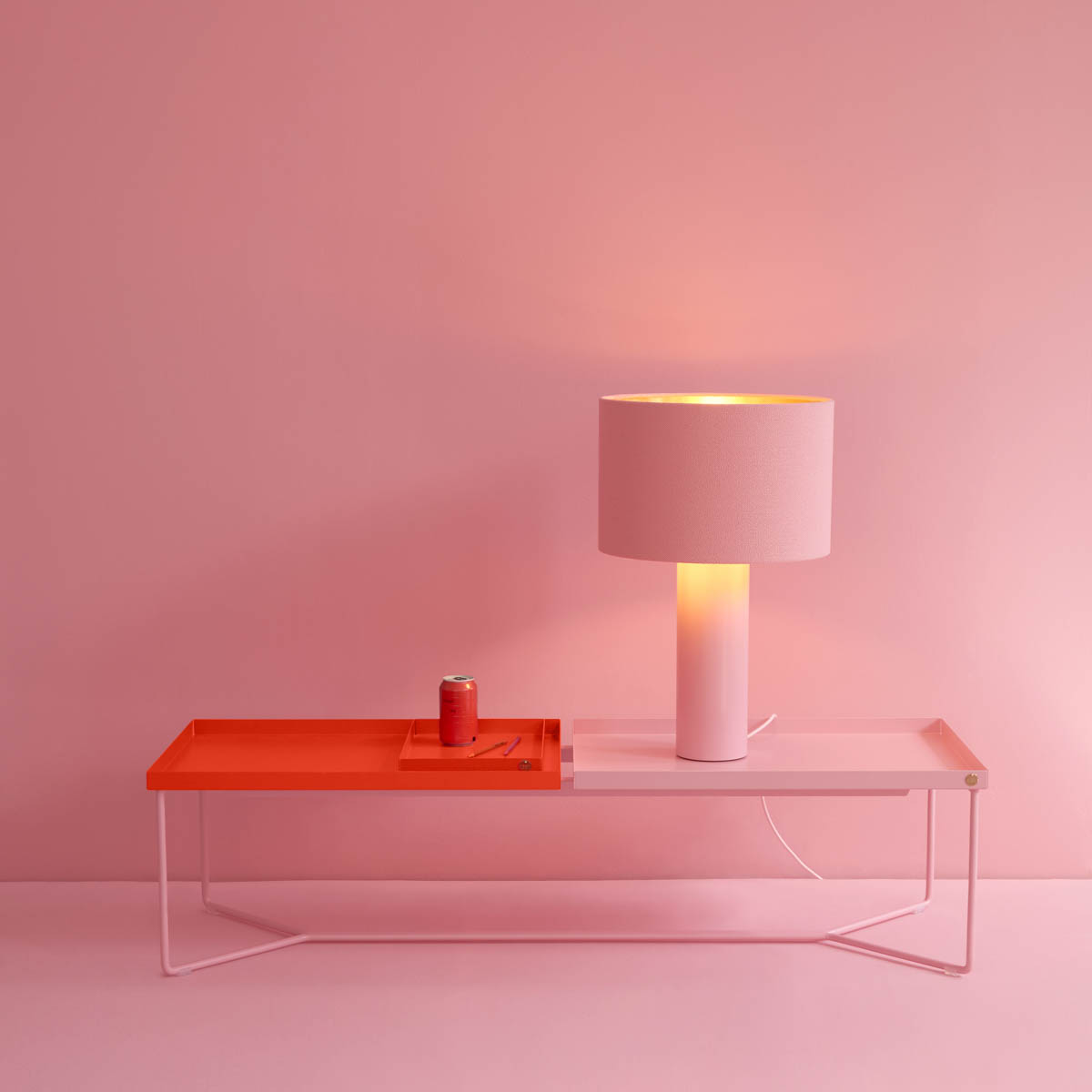 Würden sie Spalier stehen, es wären zwei formschöne und farbenfrohe Reihen. Grün neben Navy, Gelb, und Rot, Rosa neben Grau, Grasgrün und Blutorange. Oder anders platziert, zehn Farben stehen zur Auswahl. Für eine sanfte und behagliche Stimmung wäre in jedem Fall gesorgt, „All Round“ ist eine Tisch- und Stehleuchte mit einer klaren Formsprache: Ein pulverbeschichtetes Stahlrohr als Sockel, ein außen mit Wollstoff und innen mit matter Goldfolie bezogener Schirm, das Kabel mit Textil bezogen.