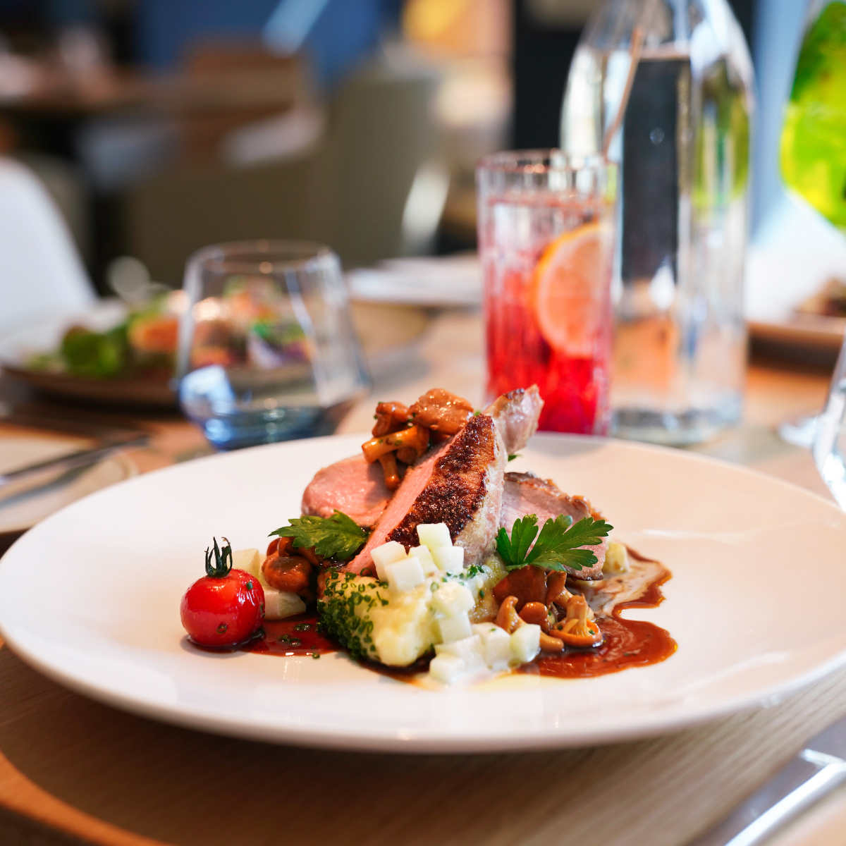 Als Dessert wählen wir das Joghurt-Limetten-Parfait mit Blaubeeren. Das Limetten-Parfait in dreieckigen Scheiben sind garniert mit Heidelbeer-Gelee-Pünktchen – hier hat jemand ein Faible für geometrische Formen. Neben der Präsentation begeistert uns auch der Geschmack, denn die sauren Noten der Limetten sind hier sehr mild und passen gut zu der Süße der Blaubeeren. Apropos blau: Zum Abschluss unseres Abends wird uns ein blauer Gin Tonic serviert – maritimer wird’s nicht.