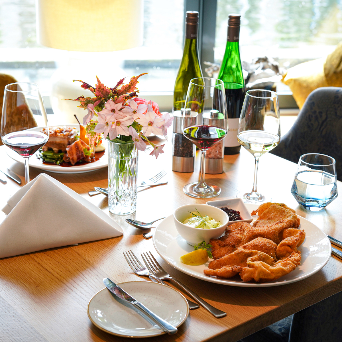 Am Abend unseres Besuchs können wir uns von der Vielseitigkeit der Speisekarte im Vlet selbst überzeugen. Wir werden freundlich begrüßt und an einen Tisch im Innenraum begleitet. Von hier genießen wir den Blick auf den Fleet und das Rathaus – es fühlt sich ein bisschen so an, als säßen wir in einem Boot.