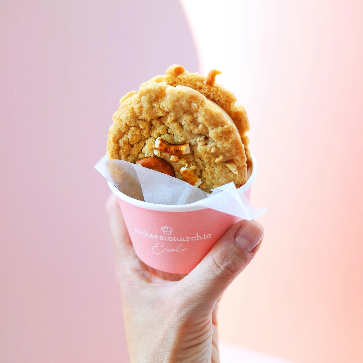 Für die Cookie-Eis-Sandwiches werden zunächst amerikanische Cookies gebacken, um mit Brezeln, Nüssen, Sprinkles oder anderen Leckereien getoppt zu werden. Zwischen die Cookies harrt zartes Eis dem Gaumen und bildet eine perfekte Kombination aus Crunch und zarter Creme.