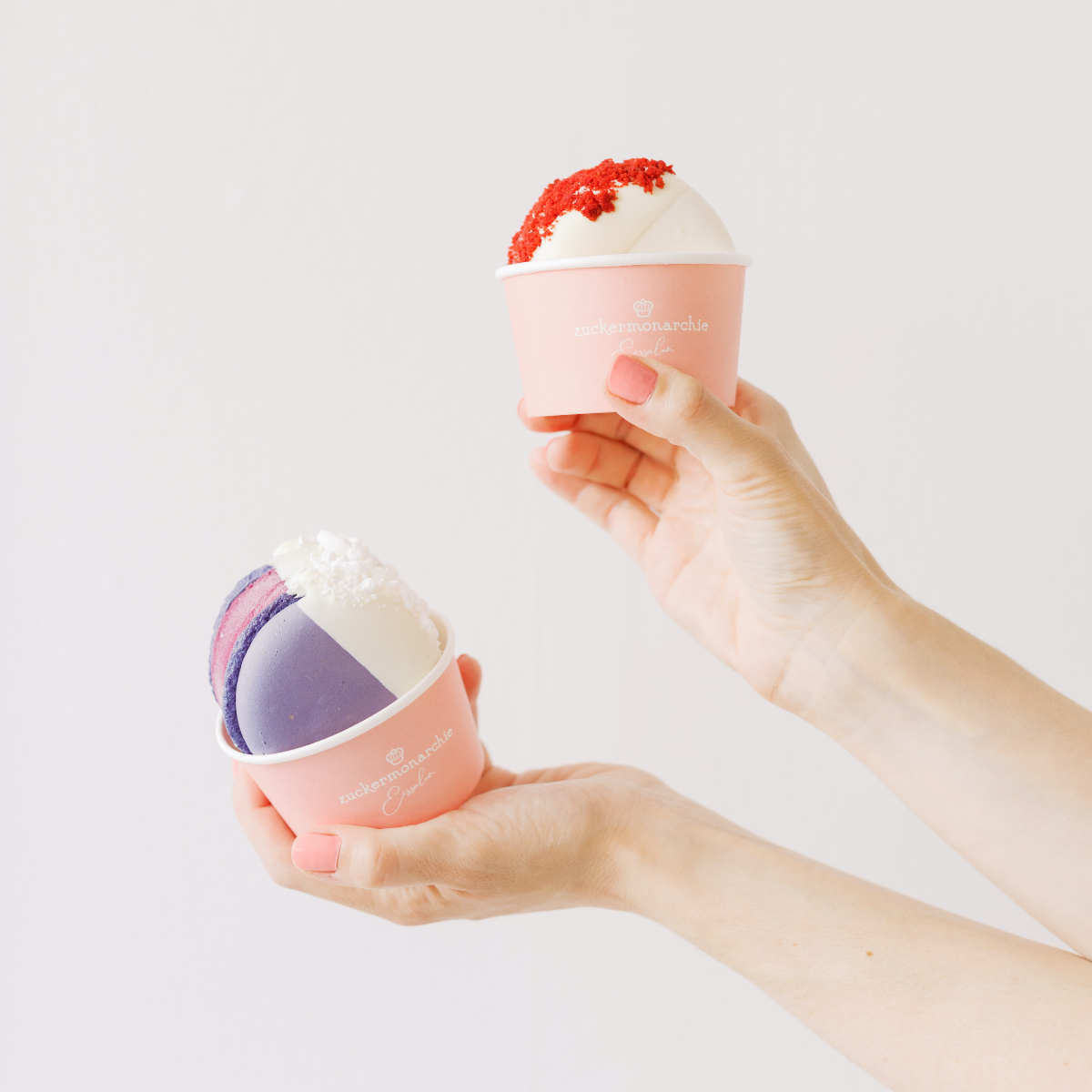 Das Softeis wird in der Zuckermonarchie aus Bio-Milch und ausschließlich Zutaten natürlichen Ursprungs hergestellt. Frische Früchte, belgische Schokolade und echte Bourbon Vanille verschmelzen hier zu cremigem Genuss. Für die Macaron-Eis-Sandwiches umschließen zwei feine Macaron-Schalen sahniges Eis und verbinden sich im Mund zu einer Geschmacksexplosion. Auch hier sieht und schmeckt man, dass die Kuchenkreationen der Zuckermonarchie als Inspirationsquelle Patin standen.