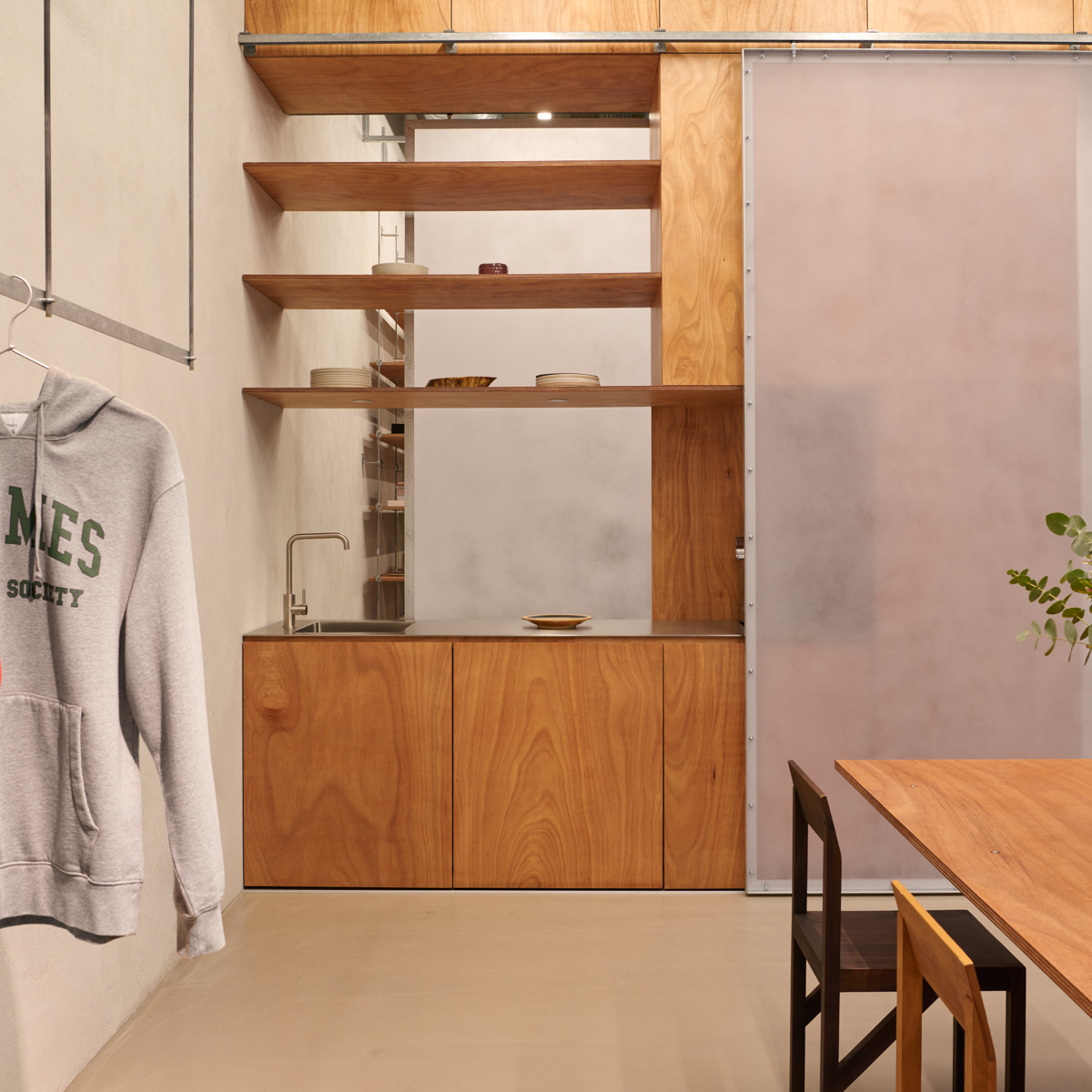 Palmes-Gründer Nikolaj Hansson entwickelte das Konzept gemeinsam mit dem gefeierten Design-Duo Frederik Gustav. Die Gestaltung nimmt Bezug auf die industrielle Historie der Umgebung: Sichtbeton und Stahl treffen auf warmes Okoumé-Holz, dessen rötlich-brauner Ton eine wohnliche Atmosphäre schafft. Statt geschlossener Wände sorgen handgeschliffene Polycarbonatflächen in Holzrahmen für fließendes Licht und großzügige Sichtachsen.