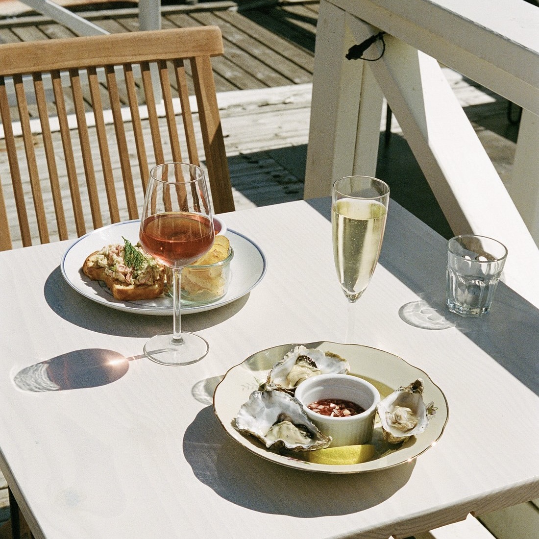 Toms weiße, einladende Austern-Hütte, die ausschaut wie ein dänisches Ferienhäuschen, befindet sich dort, wo sie am besten hinpasst, im Kopenhagener Hafen, am Wasser und, so lieben wir den Sommer, mit Terrasse. Ganz in der Nähe der Opera und des Opernparks übrigens, so dass man Kultur, Kulinarik und Stadtnatur bestens miteinander kombinieren kann.